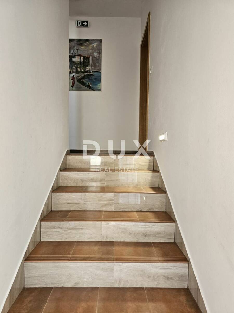 Stan je funkcionalno osmišljen, u naravi dvije odvojene stambene jedinice. Pripadaju mu hodnik, spremište, kupaonica, spavaća soba te dnevni prostor sa kuhinjom i izlazom na balkon. Preostali dio etaže sadržan je od hodnika, kupaonice, dvije spavaće sobe te dnevnog prostora također sa kuhinjom te izlazom na drugi balkon. S balkona se pruža divan pogled na more. Otvori su PVC.