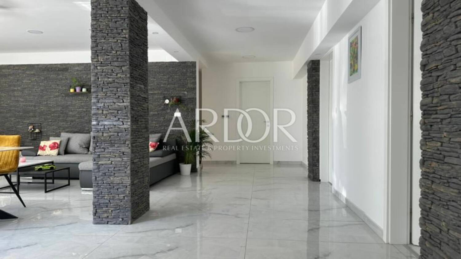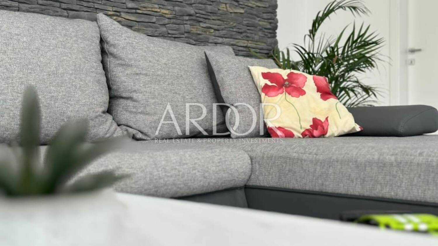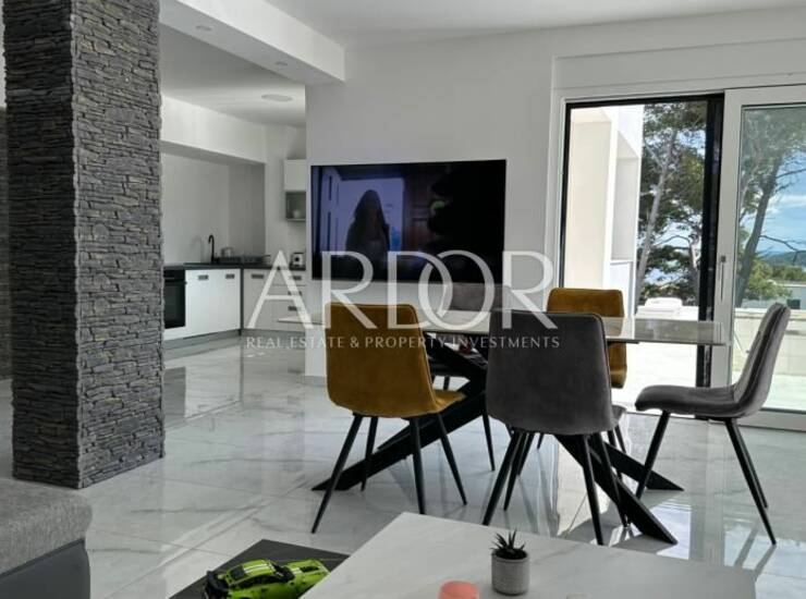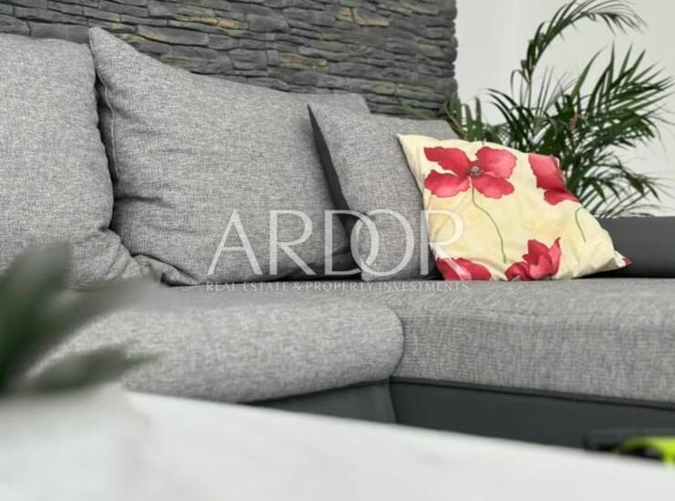 Stan se sastoji od tri komforne spavaće sobe, dvije moderno uređene kupaonice te velikog dnevnog boravka povezanog s kuhinjom i blagovaonicom. Iz glavnog dnevnog prostora pruža se spektakularan pogled koji se dodatno ističe kroz izlaz na prostranu natkrivenu terasu. Terasa se nastavlja na uređeni vanjski dio s privatnim bazenom od 25 m², sunčalištem, vanjskom kuhinjom i roštiljem, stvarajući savršenu zonu za druženja, opuštanje i uživanje tijekom cijele sezone. Okućnica od gotovo 200 m² uključuje i mali privatni voćnjak koji prostoru daje poseban šarm i dodatni osjećaj doma.
