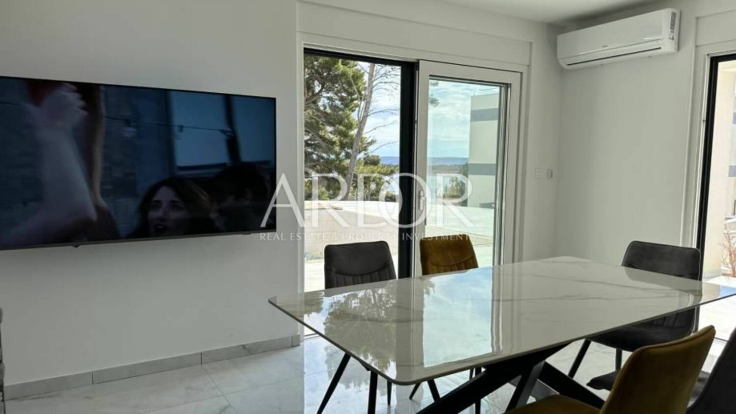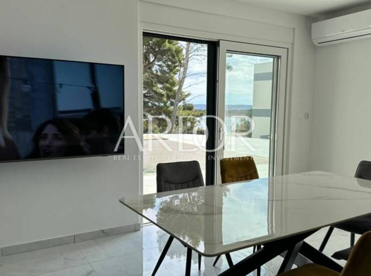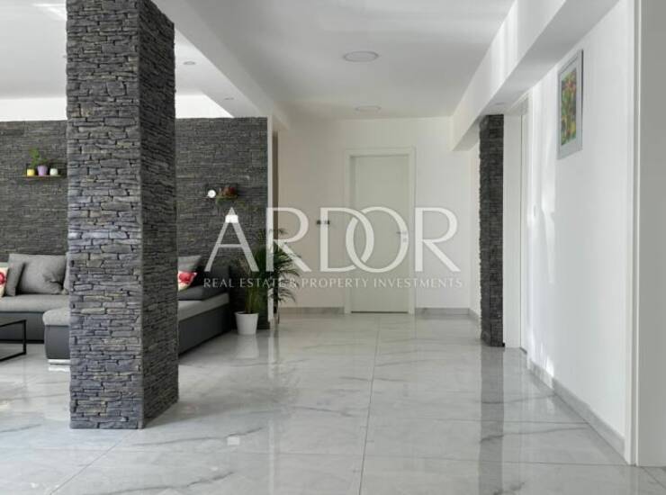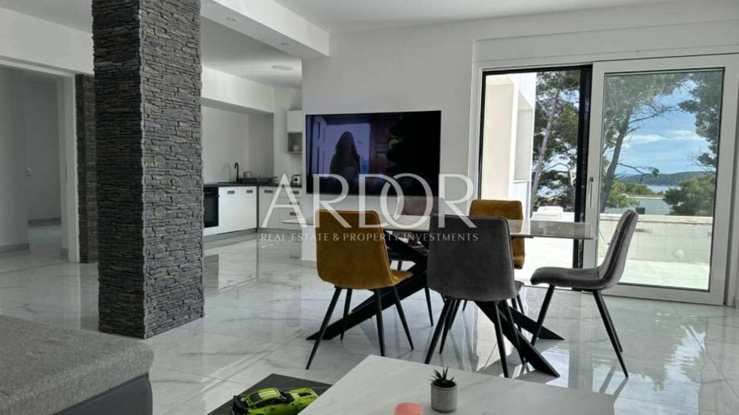 Stan se sastoji od tri komforne spavaće sobe, dvije moderno uređene kupaonice te velikog dnevnog boravka povezanog s kuhinjom i blagovaonicom. Iz glavnog dnevnog prostora pruža se spektakularan pogled koji se dodatno ističe kroz izlaz na prostranu natkrivenu terasu. Terasa se nastavlja na uređeni vanjski dio s privatnim bazenom od 25 m², sunčalištem, vanjskom kuhinjom i roštiljem, stvarajući savršenu zonu za druženja, opuštanje i uživanje tijekom cijele sezone. Okućnica od gotovo 200 m² uključuje i mali privatni voćnjak koji prostoru daje poseban šarm i dodatni osjećaj doma.