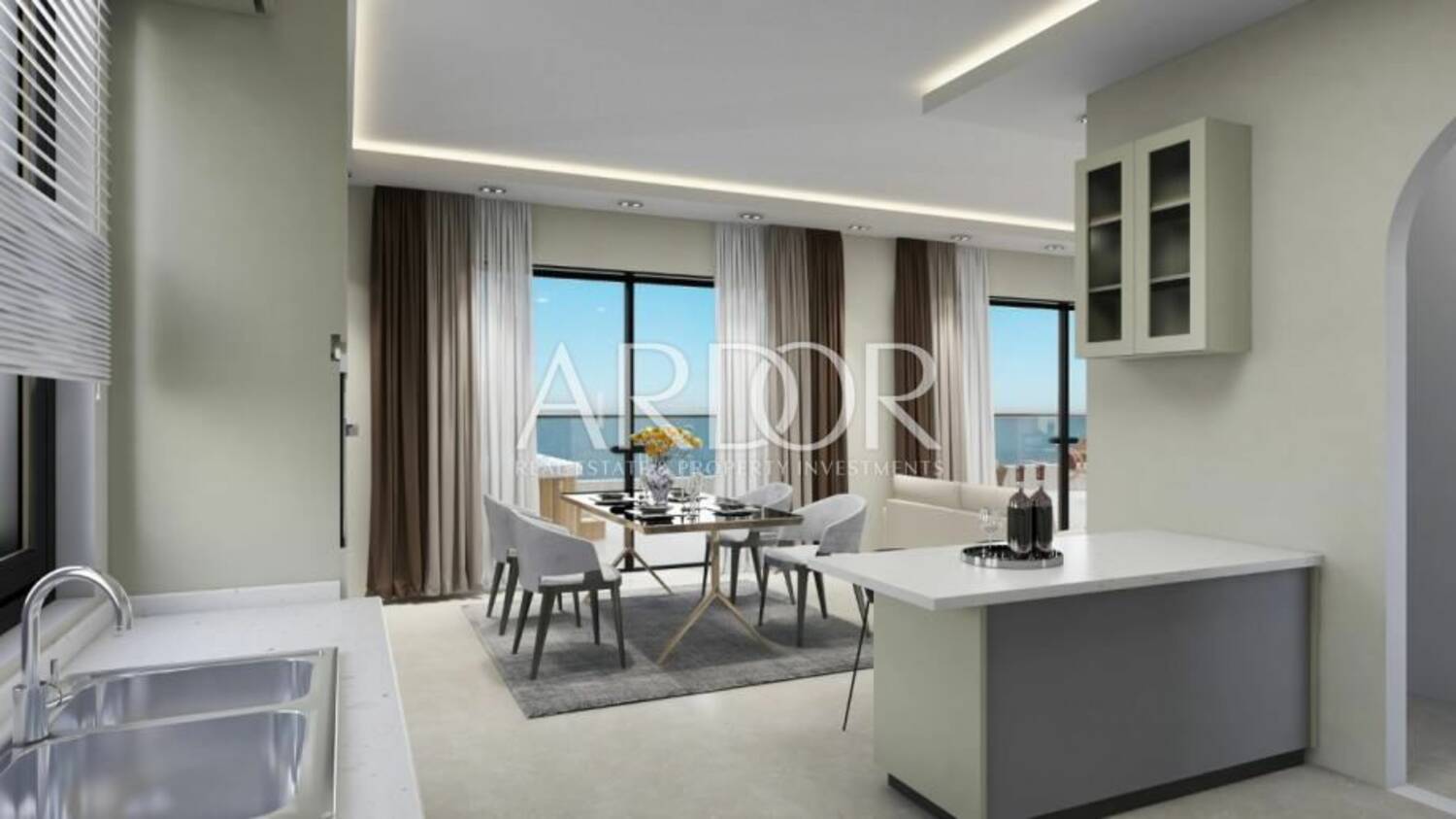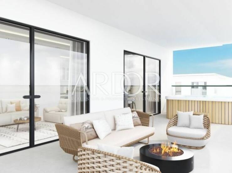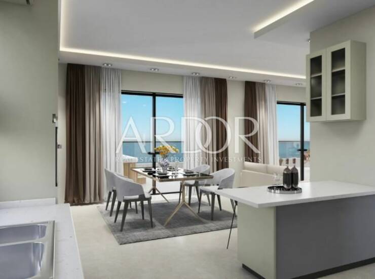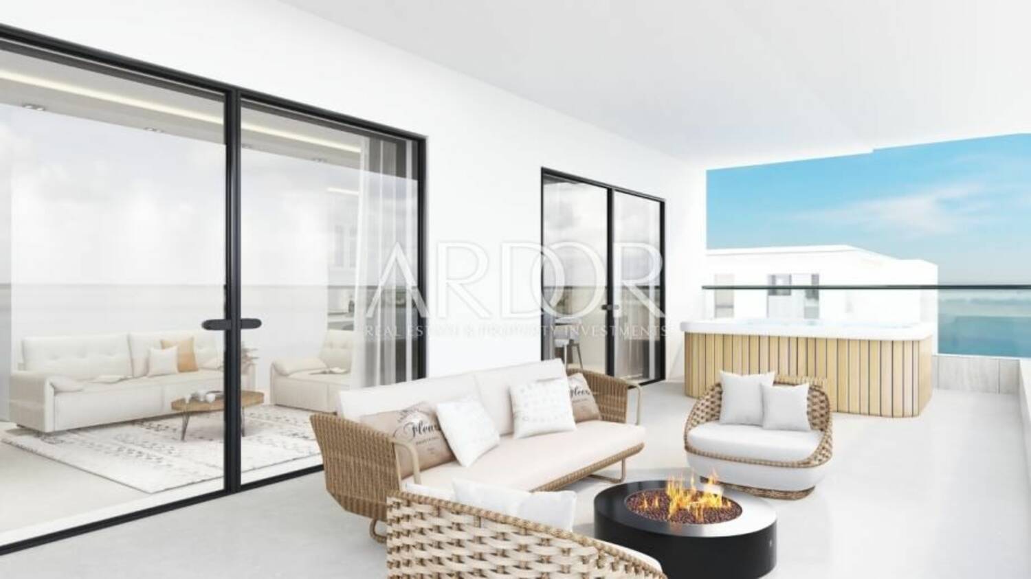 Otok Rab, Banjol, prodaje se ekskluzivni penthouse na drugom katu moderne zgrade, površine 134 m², s velikom terasom opremljenom jacuzzijem, roštiljem i lounge zonom, dijelom natkrivenom, dijelom otvorenom, s panoramskim pogledom na more, otoke Pag i Cres te grad Rab. Stan se sastoji od prostrane dnevne sobe s kuhinjom i blagovaonicom, kuhinjskog otoka, dvije kupaonice, od kojih je jedna unutar master spavaće sobe, i dvije spavaće sobe. Svakom stanu pripadaju dva privatna parkirna mjesta. PVC antracit stolarija, komarnici i elektrorolete osiguravaju moderan izgled i udobnost. Nekretnina je smještena u mirnom okruženju maslinika, 5 minuta od mora i 5 minuta automobilom od starog grada Raba, s mogućnošću pješačenja od 20 minuta ili taxi brodom za 10 minuta. Cijena je početna i vrijedi za ranu fazu prodaje uz mogućnost prilagodbe unutarnjeg uređenja.