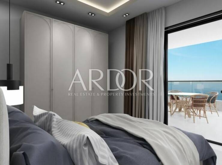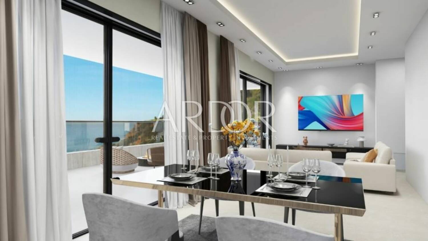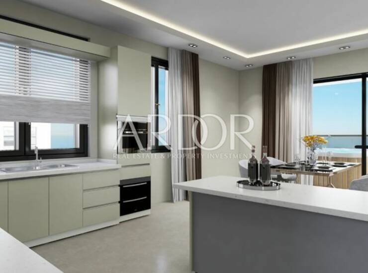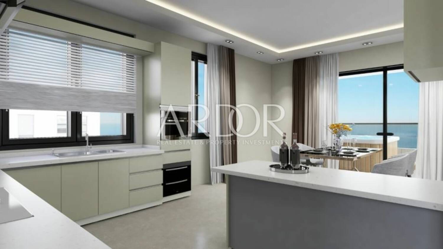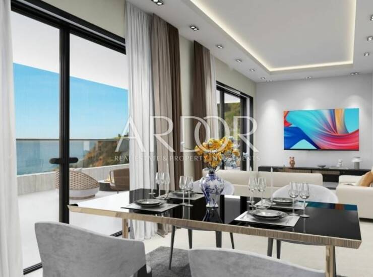 Otok Rab, Banjol, prodaje se ekskluzivni penthouse na drugom katu moderne zgrade, površine 134 m², s velikom terasom opremljenom jacuzzijem, roštiljem i lounge zonom, dijelom natkrivenom, dijelom otvorenom, s panoramskim pogledom na more, otoke Pag i Cres te grad Rab. Stan se sastoji od prostrane dnevne sobe s kuhinjom i blagovaonicom, kuhinjskog otoka, dvije kupaonice, od kojih je jedna unutar master spavaće sobe, i dvije spavaće sobe. Svakom stanu pripadaju dva privatna parkirna mjesta. PVC antracit stolarija, komarnici i elektrorolete osiguravaju moderan izgled i udobnost. Nekretnina je smještena u mirnom okruženju maslinika, 5 minuta od mora i 5 minuta automobilom od starog grada Raba, s mogućnošću pješačenja od 20 minuta ili taxi brodom za 10 minuta. Cijena je početna i vrijedi za ranu fazu prodaje uz mogućnost prilagodbe unutarnjeg uređenja.