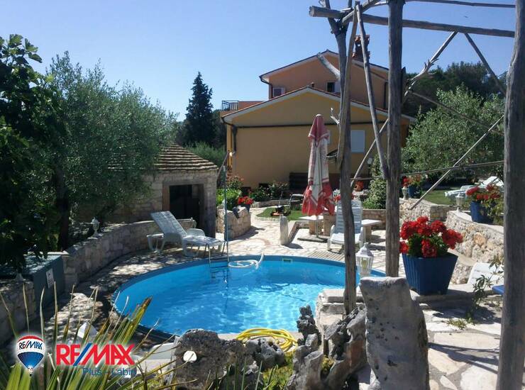 Uz kuće je okućnica na kojoj je među stoljetnim maslinama sagrađen bazen i istarski kažun u kojem se skriva sauna.
