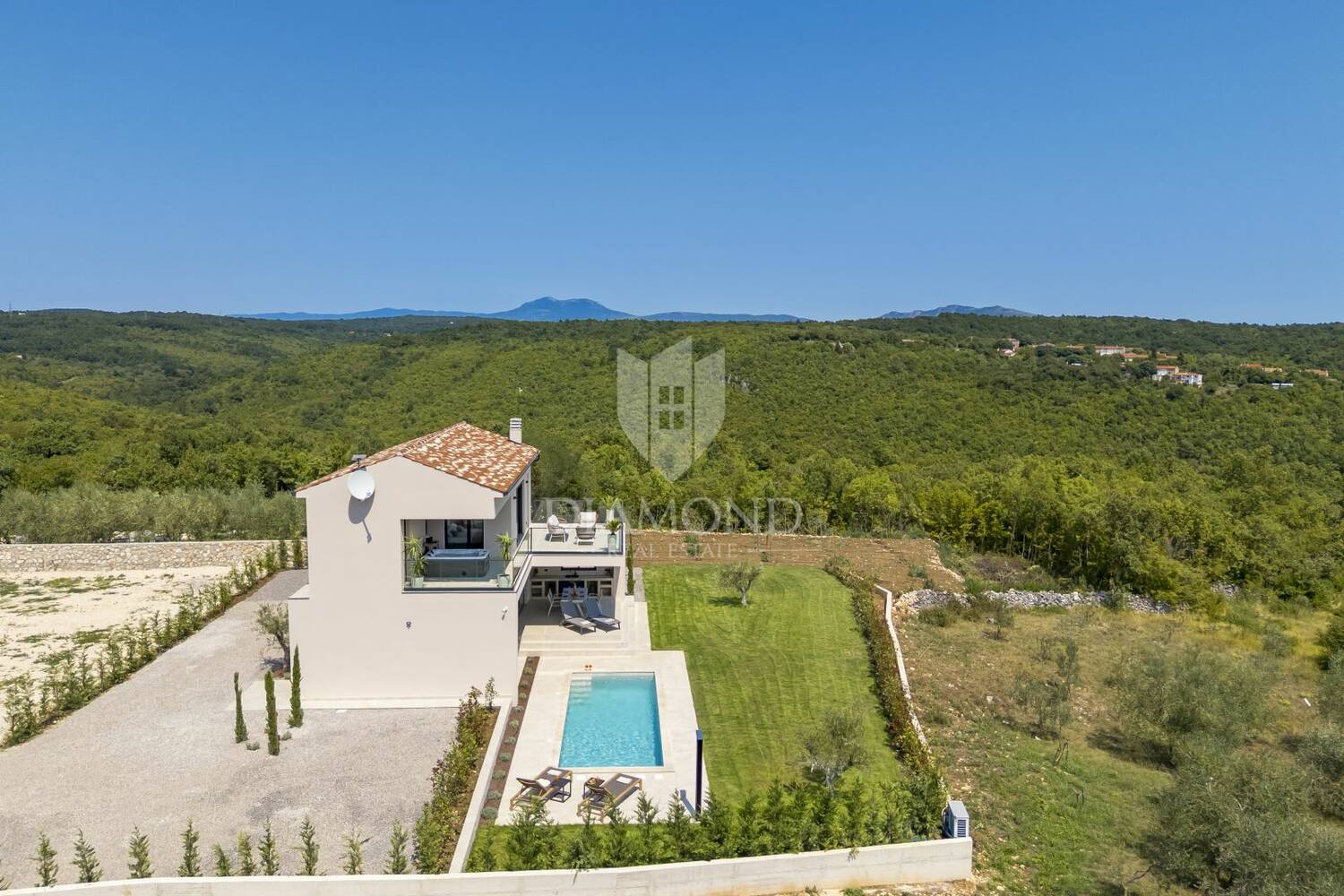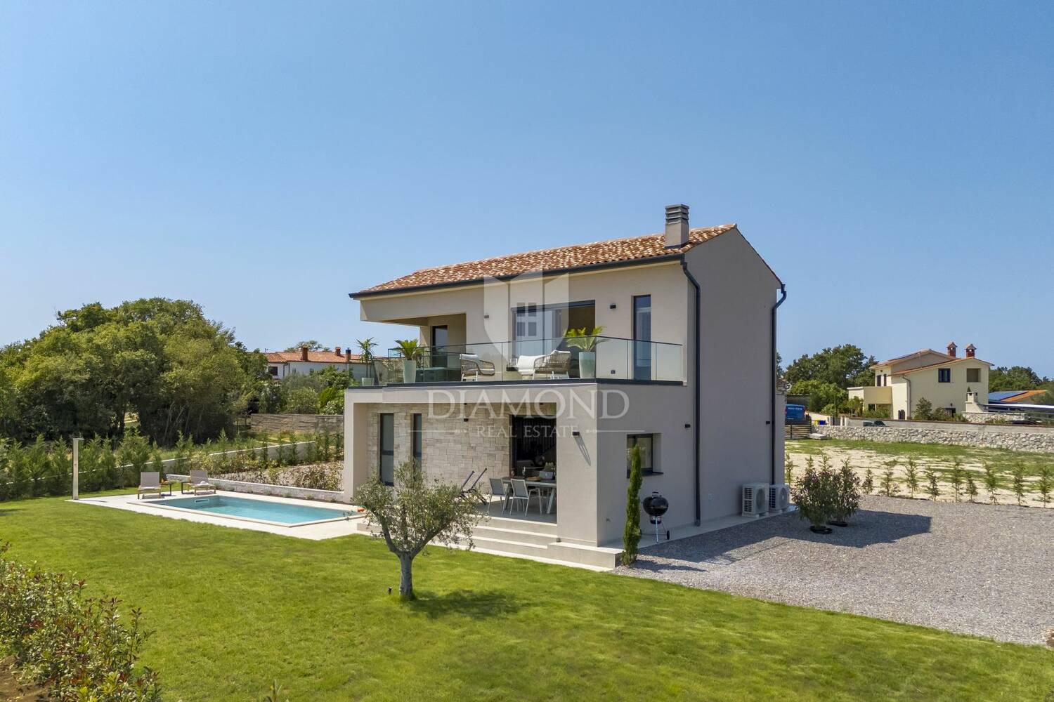 Okućnica je pažljivo uređena, s travnatim površinama, mediteranskim biljem i mladim maslinama, dok posebnu vrijednost daje grijani bazen površine 24 m2 sa sunčalištem.