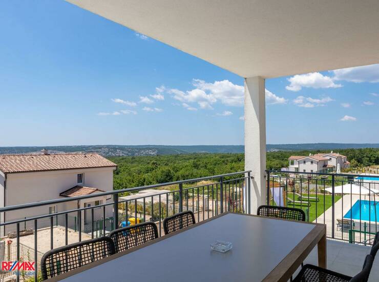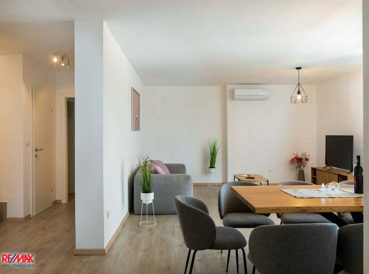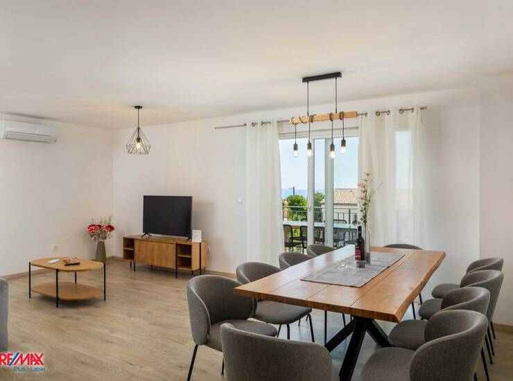Kuhinja je potpuno opremljena (aparat za kavu, perilica posuđa i ostali uređaji). Dnevni prostor je funkcionalan i ugodan za boravak.