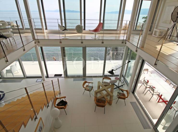 Rijeka, samo 5 m od mora prodaje se dizajnerska villa na tri etaže. Villa je izgrađena 2011 g. na parceli od 630 m2 i svojom otvorenošću prema moru i komunikacijom prostora smatra se jednom od najljepših villa na Jadranu. Villu je dizajnirao poznati arhitekt Idis Turato, a unutarnje uređenje je zasluga vlasnika. Ulaz je sa drugog kata koji je ujedno i jedna otvorena dnevna zona. Na drugom katu se nalaze još dvije spavaće sobe svaka sa svojom vlastitom kupaonom. Unutarnje stepenice i lift povezuju svaku etažu ville. Na prvom katu se nalazi kuhinja, blagovaona, gostinjski toalet i master spavaća soba sa walk in garderobom i vlastitom kupaonom. Cijela etaža ima izlaz na prostrane terase koje ju okružuju. Na srednjoj etaži se nalazi i bazen dimenzija 4*11 m2 i vanjska natkrivena lounge zona. U prizemlju se nalazi atelje vlasnika, a također ima izlaz na prostranu terasu. Ova autentična nekretnina ima vrhunsku opremu, klimatizacijski sustav Daikin (grijanje i hlađenje), 4 vanjske jedinice i 11 unutarnjih klima uređaja, sistem solarnog dogrijavanja bazena i sanitarne tople vode, centralno plinsko grijanje svake etaže, aluminijska stolarija SCHICO 70 (dupla stakla), alarmni sustav i portafon. Villa ima iza kuće okućnicu na kojoj je parking za tri vozila, a ulaz na okućnicu je ograđen na daljinsko upravljanje. U dogovoru sa vlasnikom može se prodati i dizajnerski namještaj.