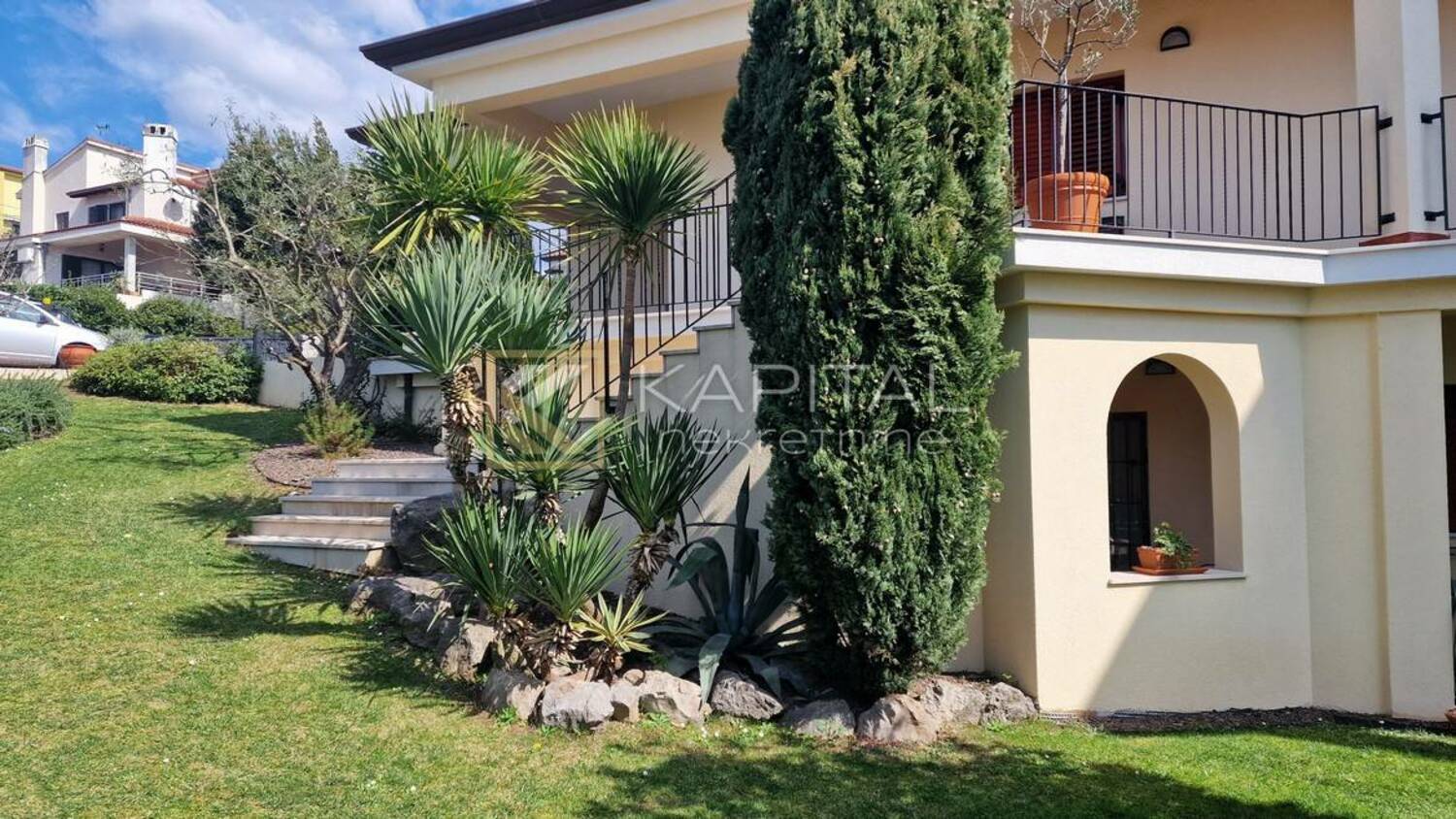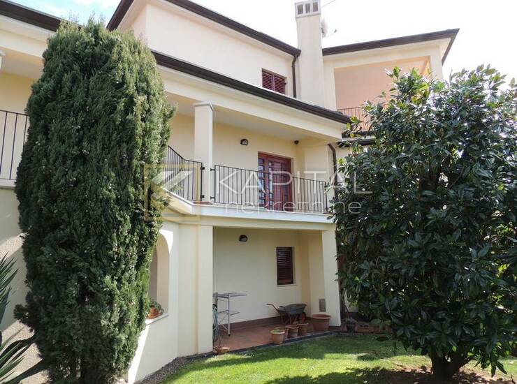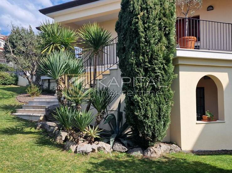 Kuća sa 2 stana od čega je prizemni veličine 108m2. Raspored 4s+db + 2 kupaone. Izlazak iz dnevnog dijela na prekrasnu okućnicu. Velika natkrivena terasa. Gornji stan (u koji se ulazi kao u prizemlje i ima pristup i iz garaže) je velik (190m2) vrlo atraktivan, dvoetažni i u niskom roh-bau. Kuća izvana sa okućnicom je kompletno uređena. Jako kvalitetna i atraktivna obiteljska kuća s predivnom okućnicom i izuzetnim pogledom na more. Odličan pristup. Naselje s urednim zgradama i blizina svih sadržaja. Rijetkost na tržištu! Samo kod nas. Za sve informacije nazovite 098/501... Prikaži broj