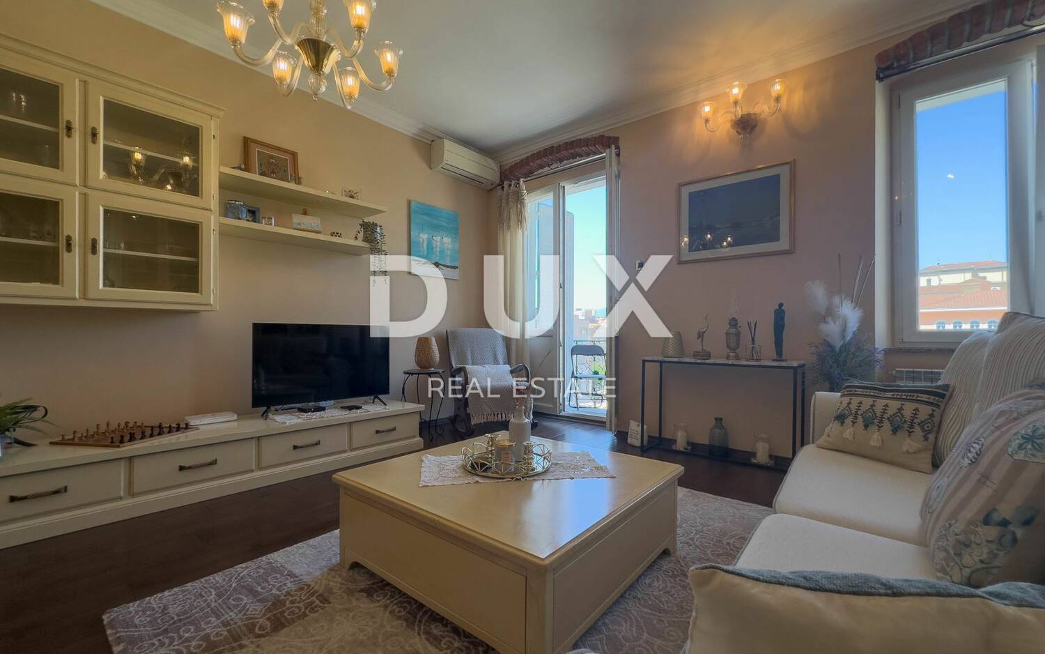 Iz dnevnog boravka se izlazi na balkon sa kojeg se pruža pogled na Učku i riječke krovove.