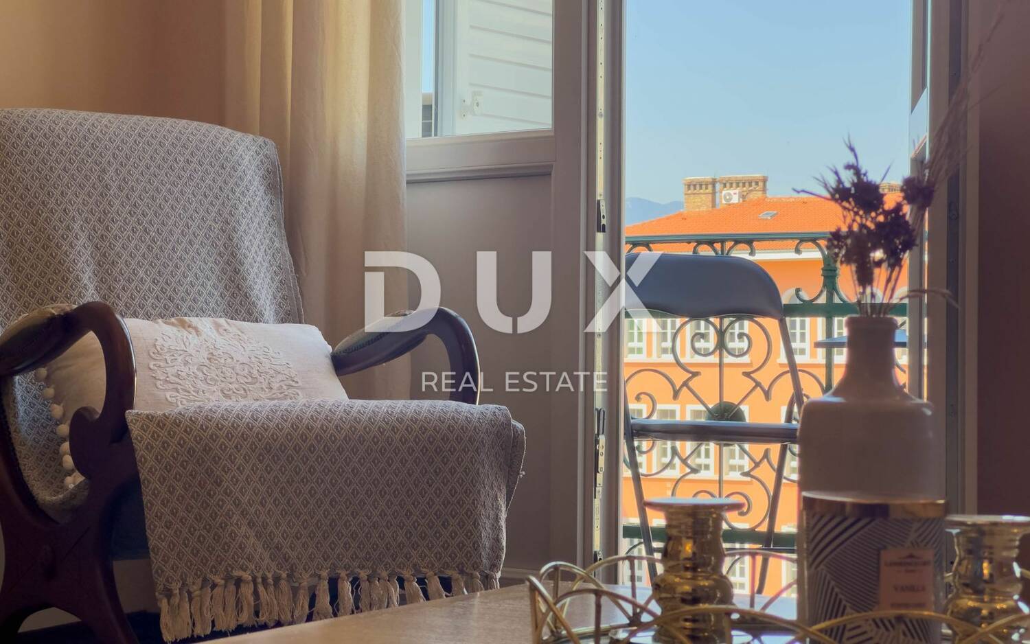 Stan od 93 m2 je namješten u mediteranskom stilu, a nalazi se na četvrtom katu stare riječke zgrade tzv. gospodarskoj zgradi, bogate povijesti i tipičnog izgleda za prošlo stoljeće s visokim stropovima i velikim prozorima.