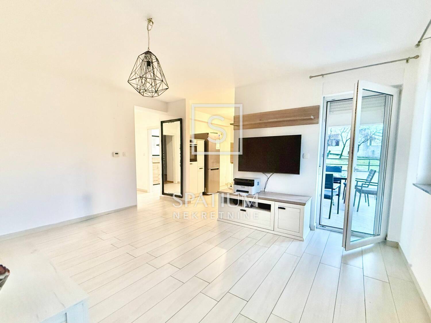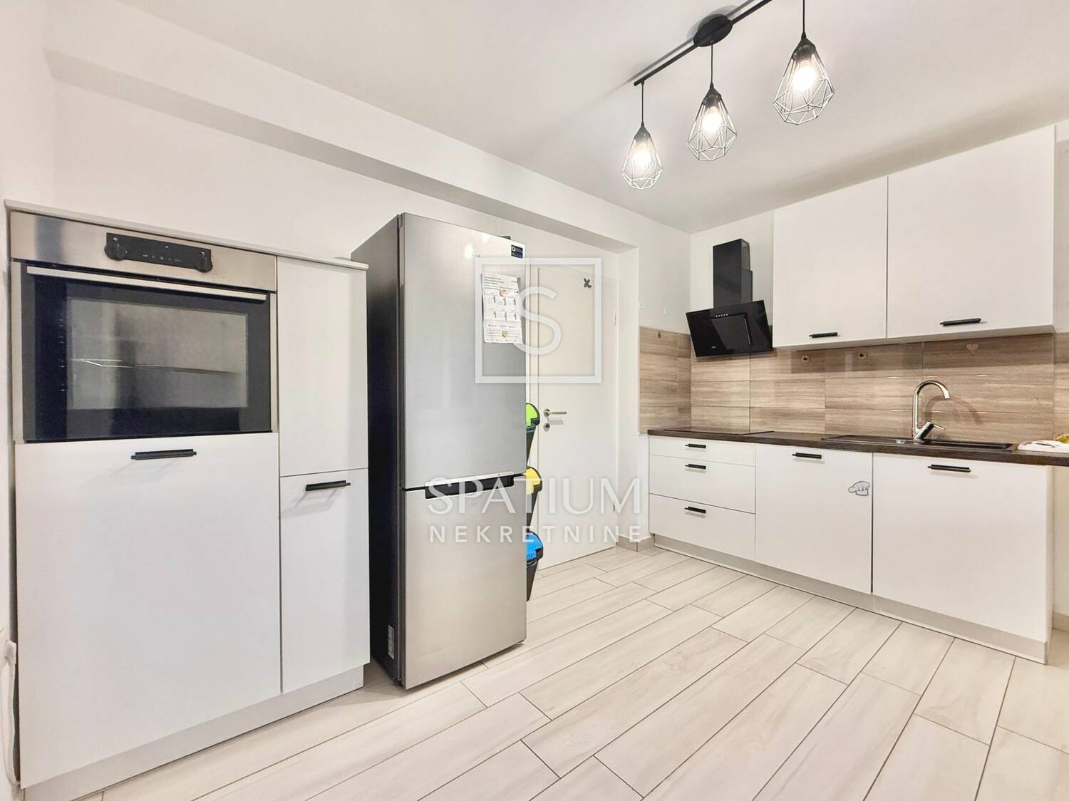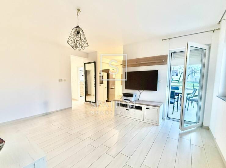 Stan se sastoji od prostranog dnevnog boravka, kuhinje, dvije spavaće sobe, kupaonice, ostave, ulazne izbe i hodnika. Iz dnevnog boravka izlazi se na prostrani i osunčani južni balkon s pogledom na zelenu okolinu, dok se iz jedne spavaće sobe izlazi na sjevernu terasu / okućnicu površine 36 m², idealnu za boravak na otvorenom. Zahvaljujući funkcionalnom rasporedu, stan se uz manji zahvat može preurediti u manji 3S+DB.