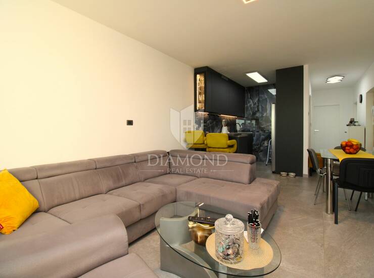 Stan se sastoji od svijetlog dnevnog boravka, kuhinje po mjeri s blagovaonicom, dvije spavaće sobe i moderne kupaonice. Renovacija je završena 2023. godine i obuhvatila je nove instalacije, podove, stolariju i sve završne radove, što osigurava visoku razinu udobnosti i energetske učinkovitosti.