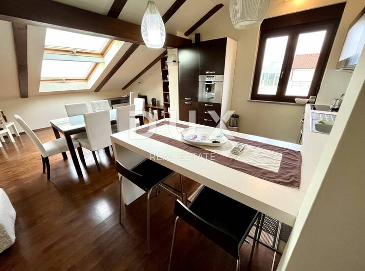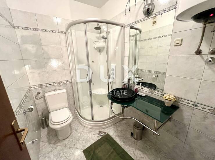 Stan se prostire na dvije etaže te je pažljivo osmišljen kako bi ponudio maksimalnu udobnost i praktičnost u svakodnevnom životu. Sastoji se od dvije velike spavaće sobe, prozračnog dnevnog boravka koji odiše elegancijom i svjetlošću, kuhinje s blagovaonicom, dvije moderno uređene kupaonice te loggie s koje se pruža prekrasan, panoramski pogled na grad i more. Jugozapadna orijentacija osigurava obilje prirodnog svjetla tijekom cijelog dana, stvarajući ugodnu i opuštajuću atmosferu.