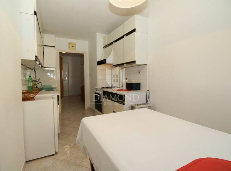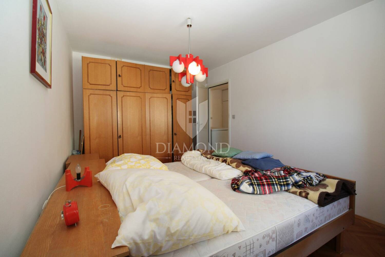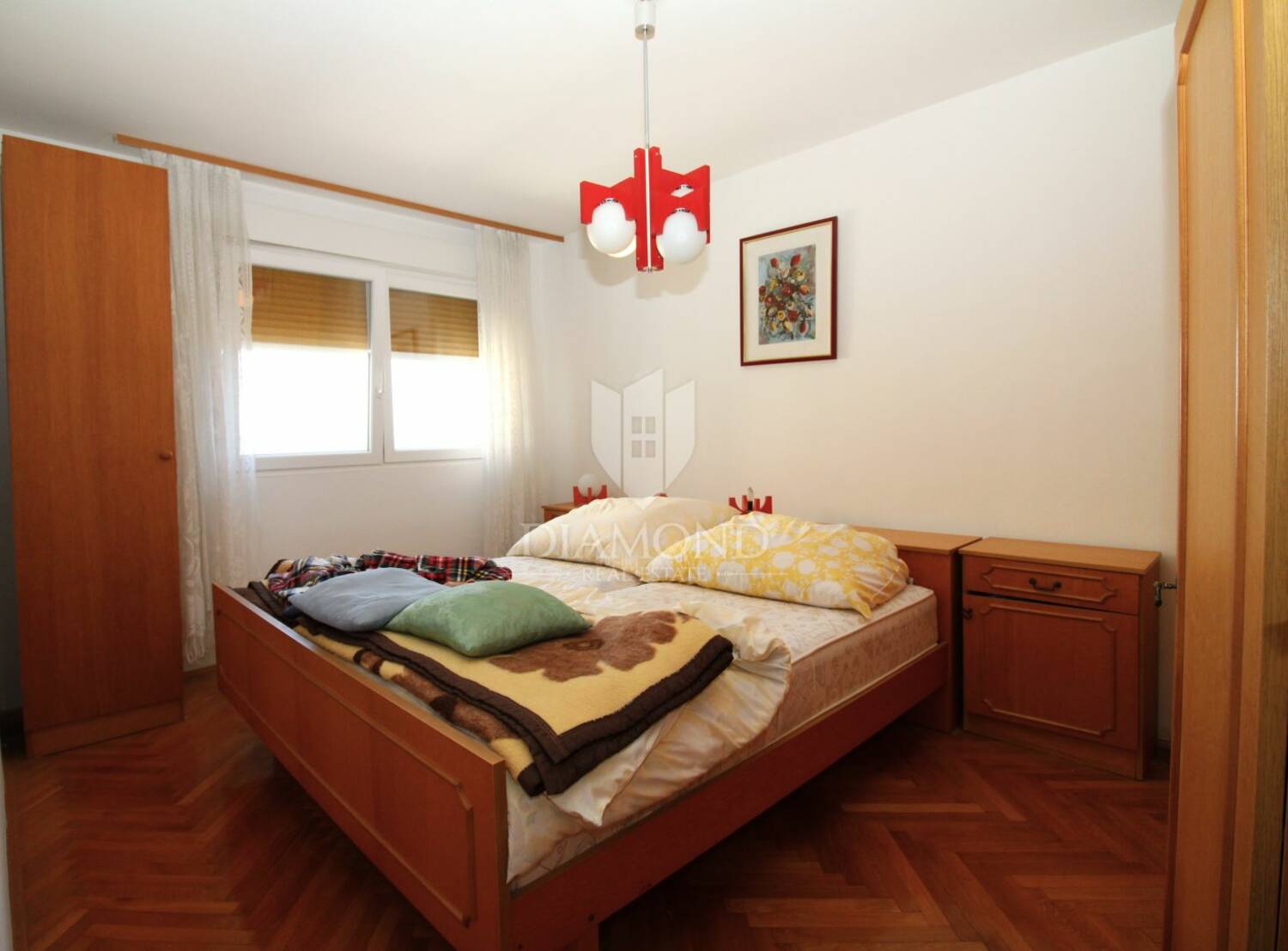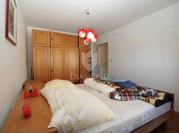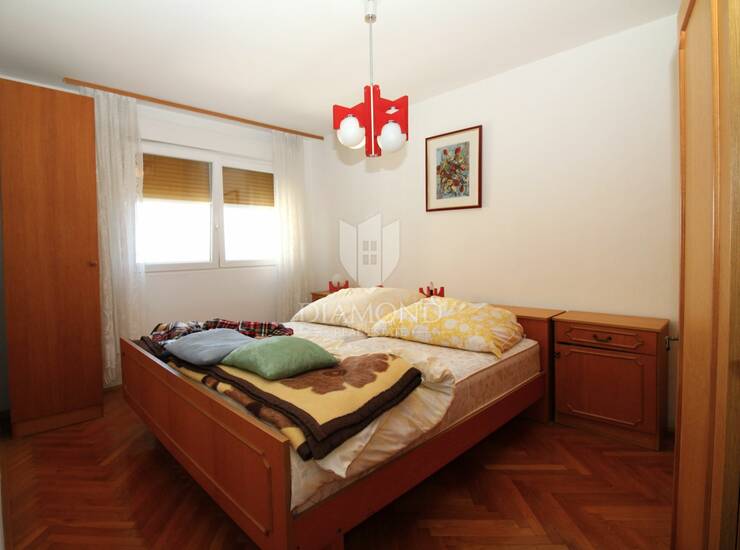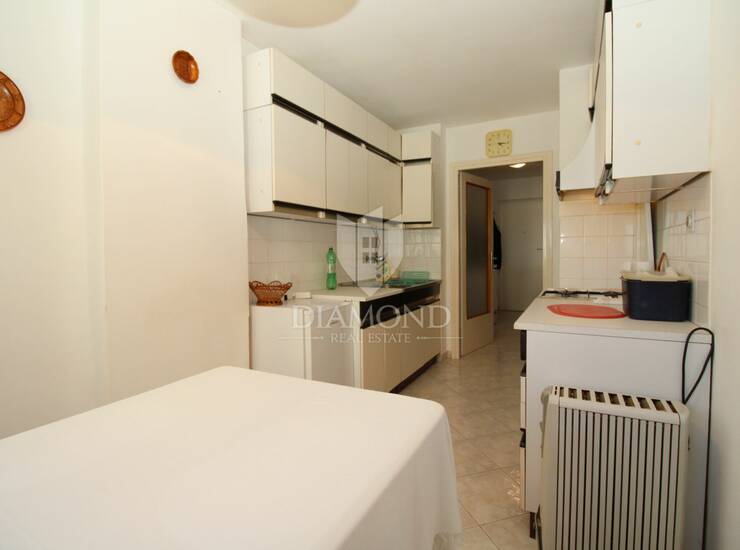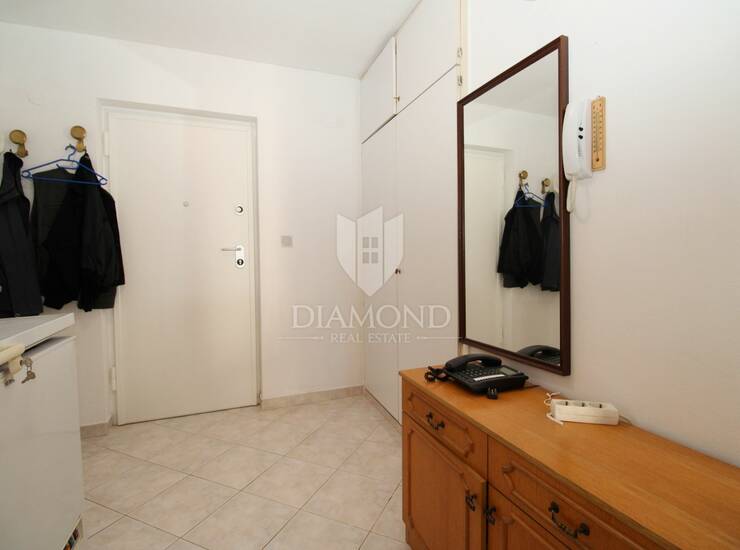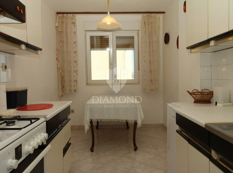 Stan se sastoji od ulaznog hodnika s praktičnim ugradbenim ormarom, dnevnog boravka, kuhinje s blagovaonicom, spavaće sobe, kupaonice i balkona s kojeg se pruža pogled prema moru. Prozori u kuhinji i spavaćoj sobi već su zamijenjeni, a za dodatno osvježenje prostora novim vlasnicima preostaje tek zamjena balkonskih vrata i kuhinje – što predstavlja manju prilagodbu, a ne veliku investiciju.