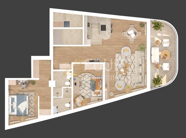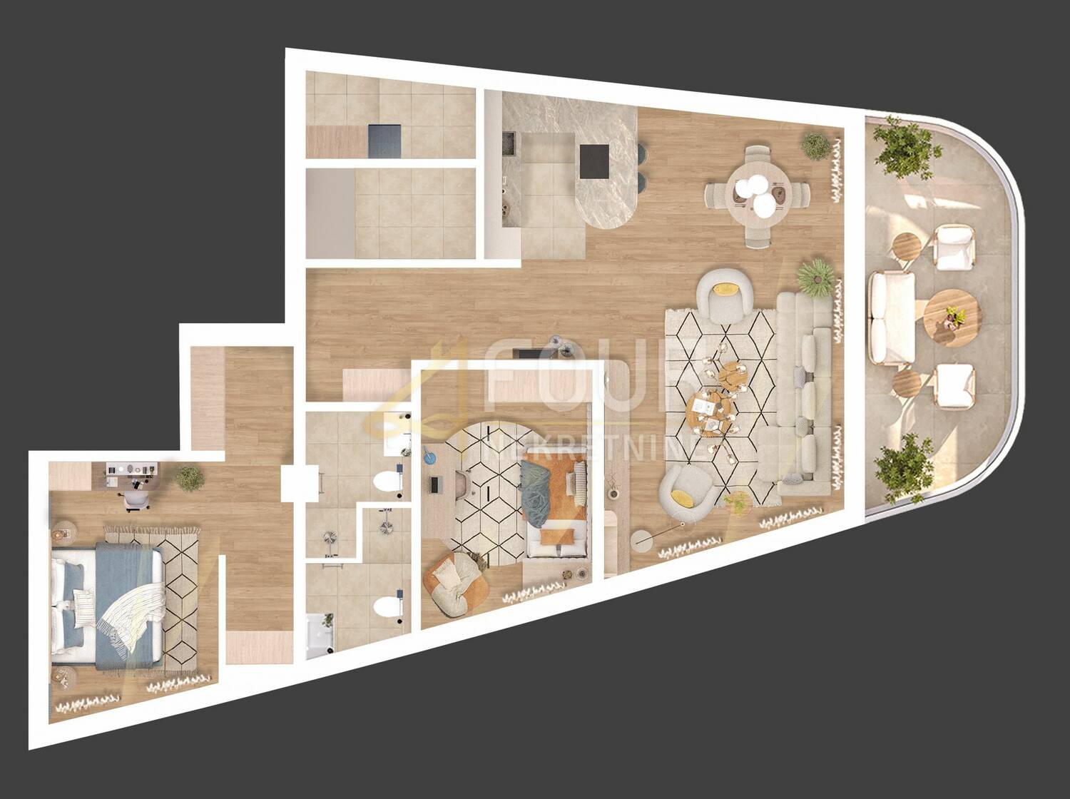 U ponudi je dvosobni stan s dnevnim boravkom, ukupne površine 100.87m2, smješten u novom luksuznom stambenom kompleksu.