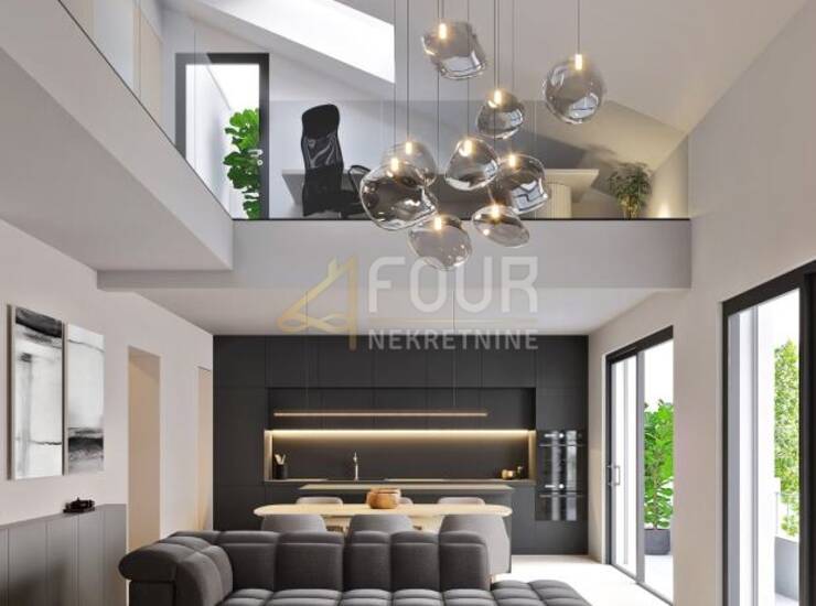 Stan je pažljivo i kvalitetno izveden, opremljen podnim grijanjem na dizalicu topline, aluminijskom stolarijom vrhunske izvedbe te sanitarnom opremom i materijalima visokog standarda. U cijenu je uključena kuhinja po mjeri. Uz stan dolaze tri vanjska parkirna mjesta .
