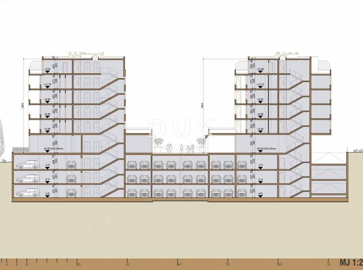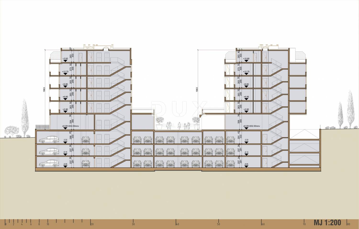 Predstavljamo moderan stambeno-poslovni kompleks na Srdočima, projektiran kao funkcionalna i suvremena cjelina koja obuhvaća tri podzemne etaže garaža, prizemlje s poslovnim prostorima te pet katova stanova. Kompleks se sastoji od dvije zgrade međusobno povezane uređenim pješačkim trgom, koji će služiti kao ugodan prostor za kretanje i druženje stanara. U prizemlju su smješteni poslovni sadržaji koji dodatno unapređuju kvalitetu svakodnevnog života, nudeći praktičnost i usluge na dohvat ruke.