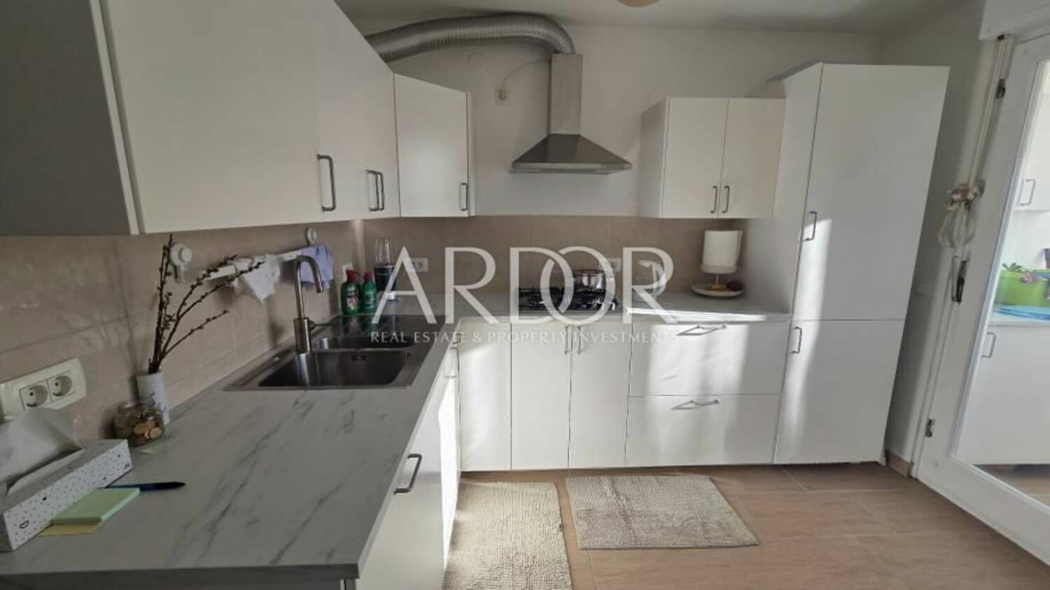 Kuhinja je odvojena od dnevnog boravka vratima, što omogućuje kontrolu širenja mirisa i dodatnu privatnost prostora.