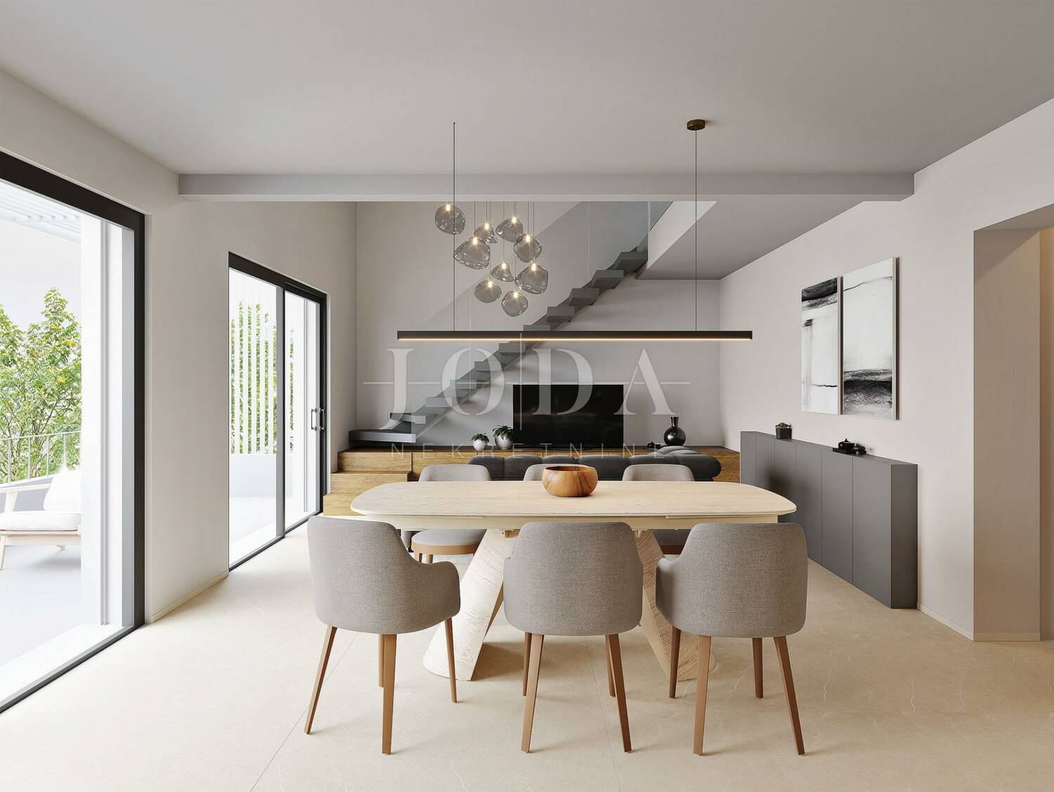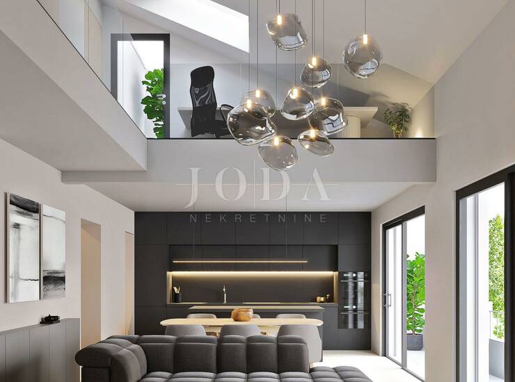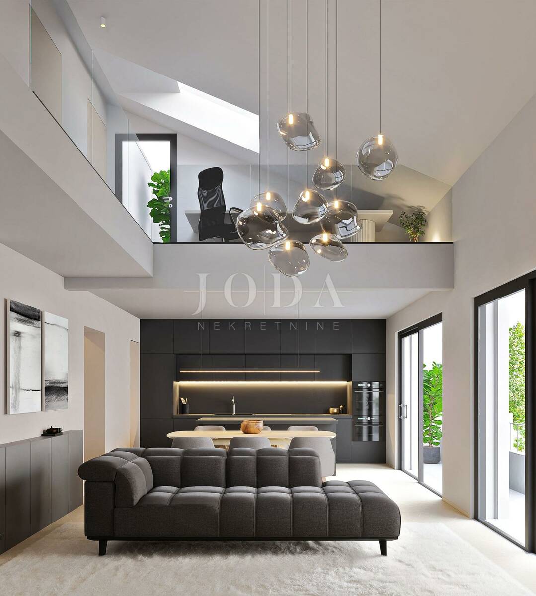 Stan se sastoji od tri spavaće sobe te otvorenog koncepta kuhinje, blagovaonice i dnevnog boravka. Uz to, tu su praonica, garderoba, spremište, galerija, dvije kupaonice i odvojeni toalet. Iz dnevnog dijela izlazi se na terasu od 14 m², dok galerija vodi na krovnu terasu površine 10 m², potpuno zaštićenu od pogleda.