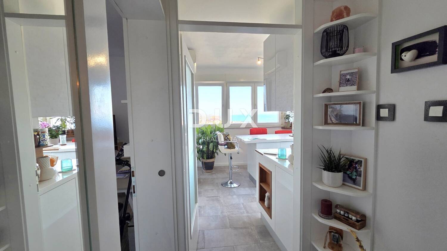 Hodnik je organiziran s ugradbenim ormarima i detaljima koji spajaju estetiku i praktičnost, dok spavaća soba i dnevni boravak nude sklad funkcije i udobnosti kroz pažljivo birane komade namještaja. Kuhinja je moderna i kompletno opremljena, uključujući i šank koji dodatno povezuje prostor.