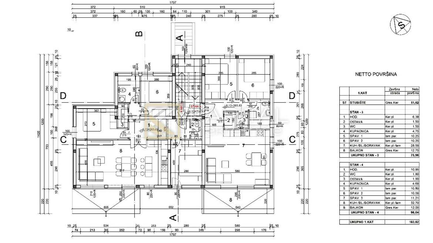 Ovaj stan je službeno prvi ali se nalazi na drugom katu. U suterenu je natkriveni prostor koji se dijeli u 4 dijela i svakom stanu pripada po jedan dio. Grijanje će biti podno putem dizalice topline. U dnevnom dijelu dolazi jedna klima. Svakom stanu pripadaju 2 parkirna mjesta. Zidna stijena će biti podizno klizna s troslojnim staklom a između stanova dodatna zvučna izolacija. Panoramski pogled na more. Gradska kanalizacija. Postoji mogućnost dogovora u svezi unutarnjeg uređenja kako bi se maksimalno približilo željama kupca. Samo u našoj agenciji! Za sve informacije nazovite 098/501... Prikaži broj