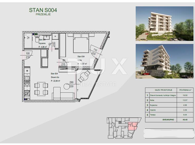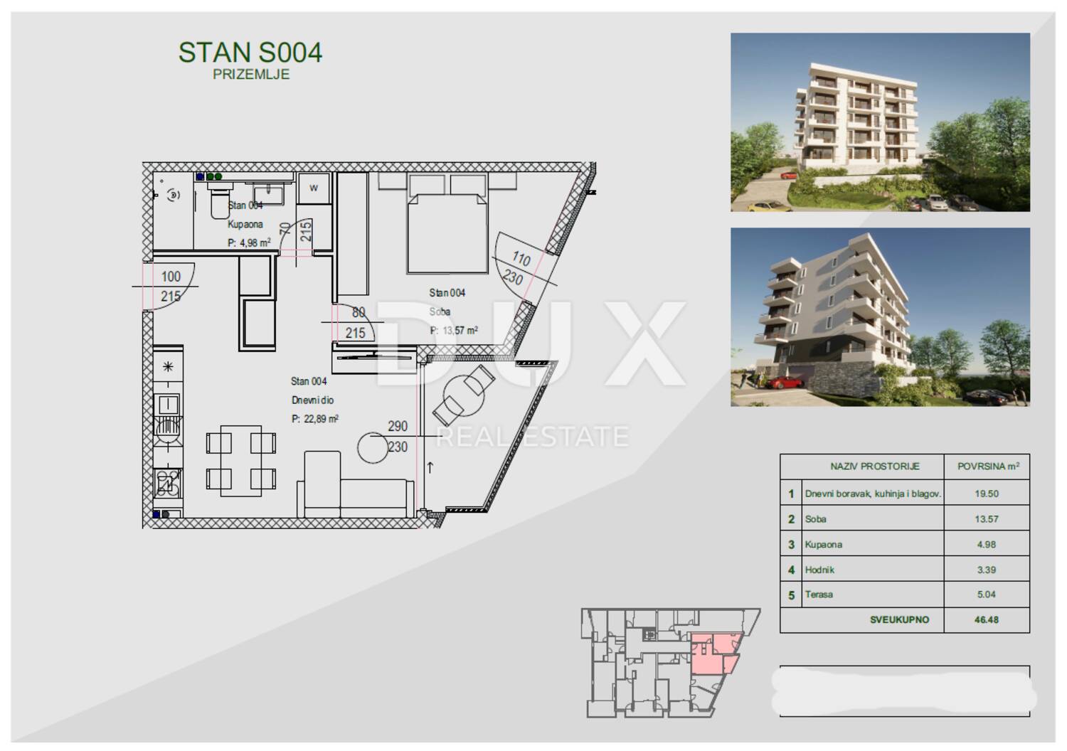 Ekskluzivan stan 1S+DB, površine 46,48 m2 u prizemlju s pogledom na more u kvalitetnoj novogradnji + parkirno mjesto.