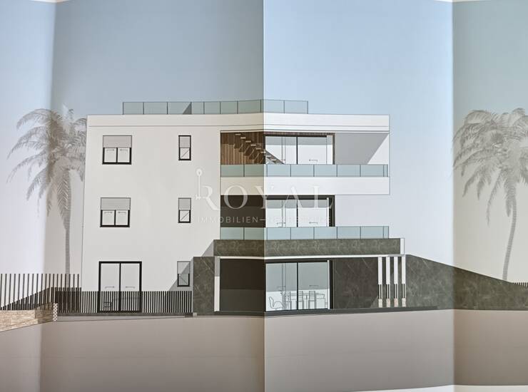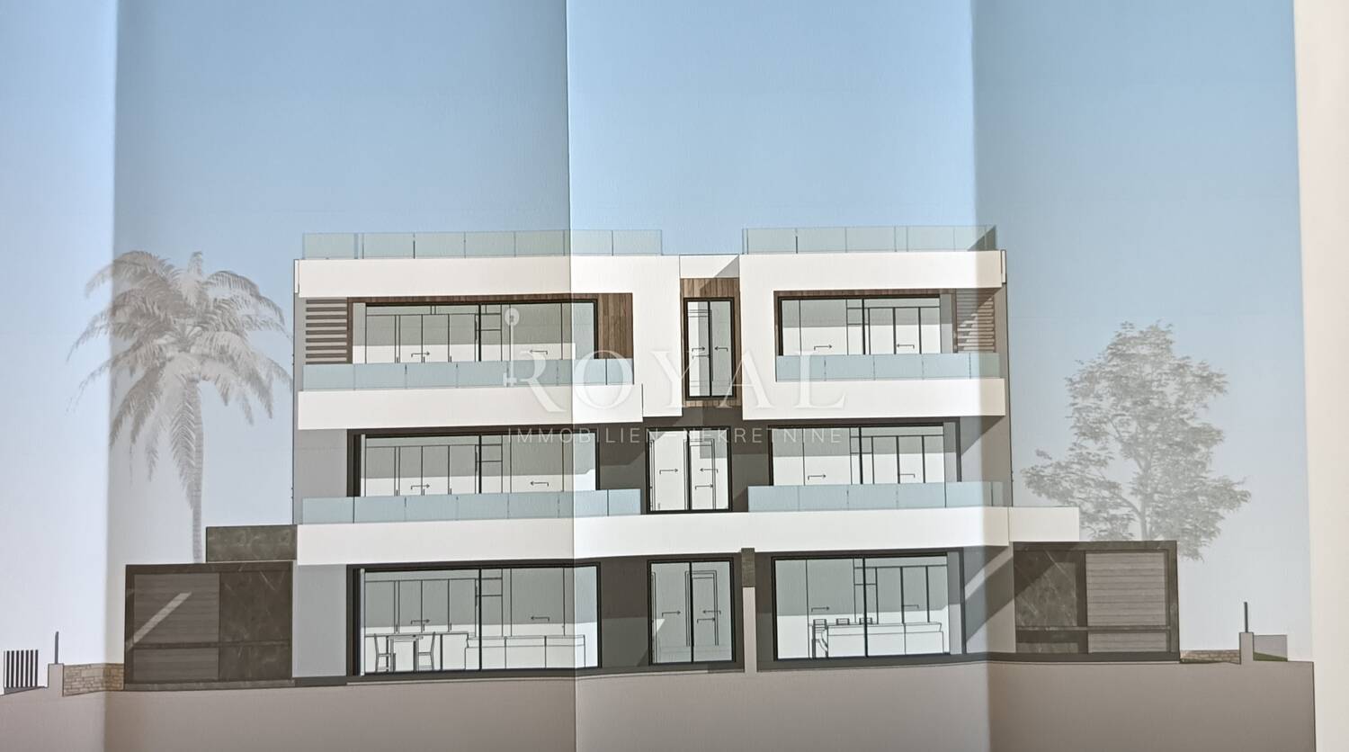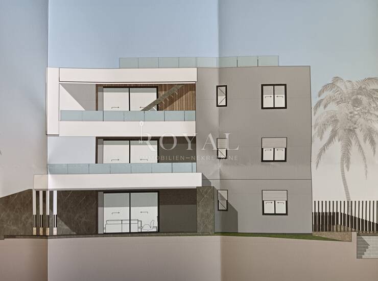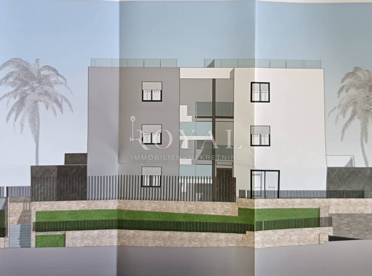 Martinkovac, građevinsko zemljište za šest stambenih jedinica s garažom, stanovi su dvosobni i trosobni s dnevnim boravkom, velike terase, pogled na more.