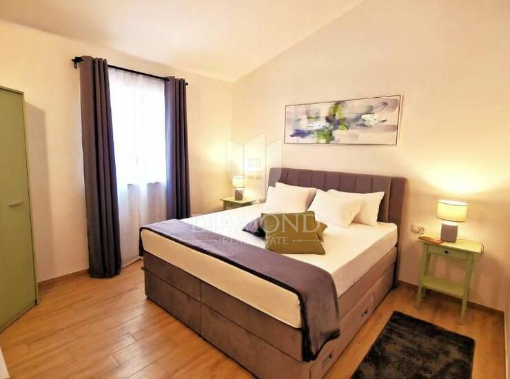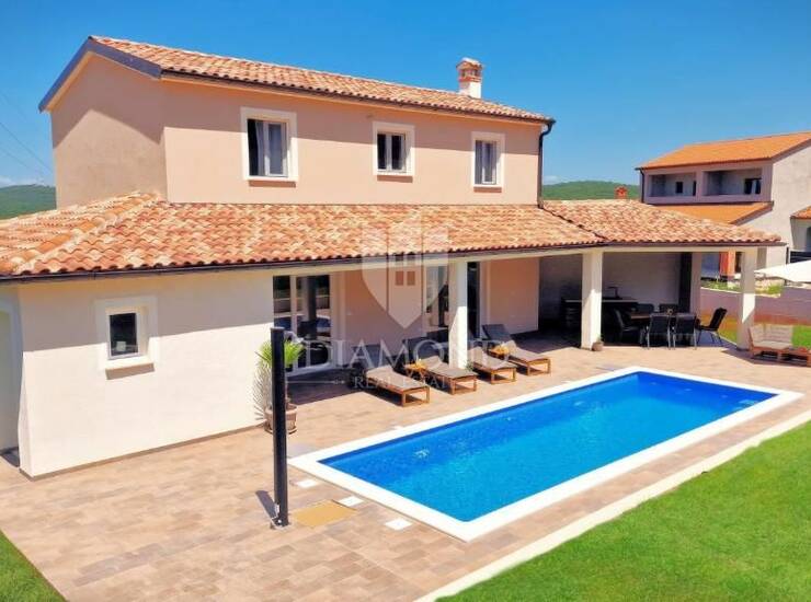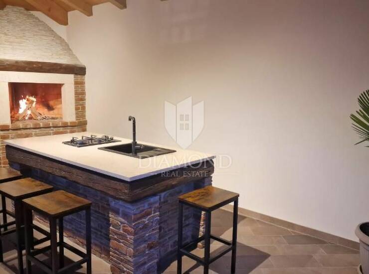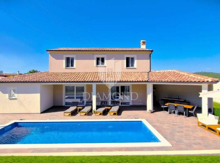 Na prodaju je predivna moderna kuća za odmor izgrađena 2024. godine, smještena u mirnom dijelu općine Rovinj, okružena zelenilom i prirodom, a ipak u neposrednoj blizini svih ljepota i sadržaja koje Rovinj nudi. Ova elegantna vila nudi dvije prostrane spavaće sobe s queen-size krevetima, dnevni boravak s kutnom garniturom na razvlačenje i vlastitom kupaonicom te potpuno opremljenu kuhinju, savršenu za pripremu obiteljskih ili prijateljskih druženja. Ispred kuće nalazi se privatni bazen duljine 8,5 metara, vanjska kuhinja s kaminom, prostrana terasa i raskošni vrt s dovoljno prostora za igre i aktivnosti na otvorenom, kao i privatno parkiralište. S kapacitetom do šest osoba, ova vila je idealna za obitelji, prijatelje ili investiciju u turistički najam. Smještena tek 8 km od Katedrale sv. Eufemije i 39 km od Amfiteatra u Puli, kuća savršeno spaja mir, privatnost i brz pristup kulturnim i turističkim atrakcijama. Otkrijte svoj kutak za odmor i uživanje u prirodi, luksuzno uređen i s pogledom na bazen, gdje svaki dan pruža osjećaj odmora i opuštanja.