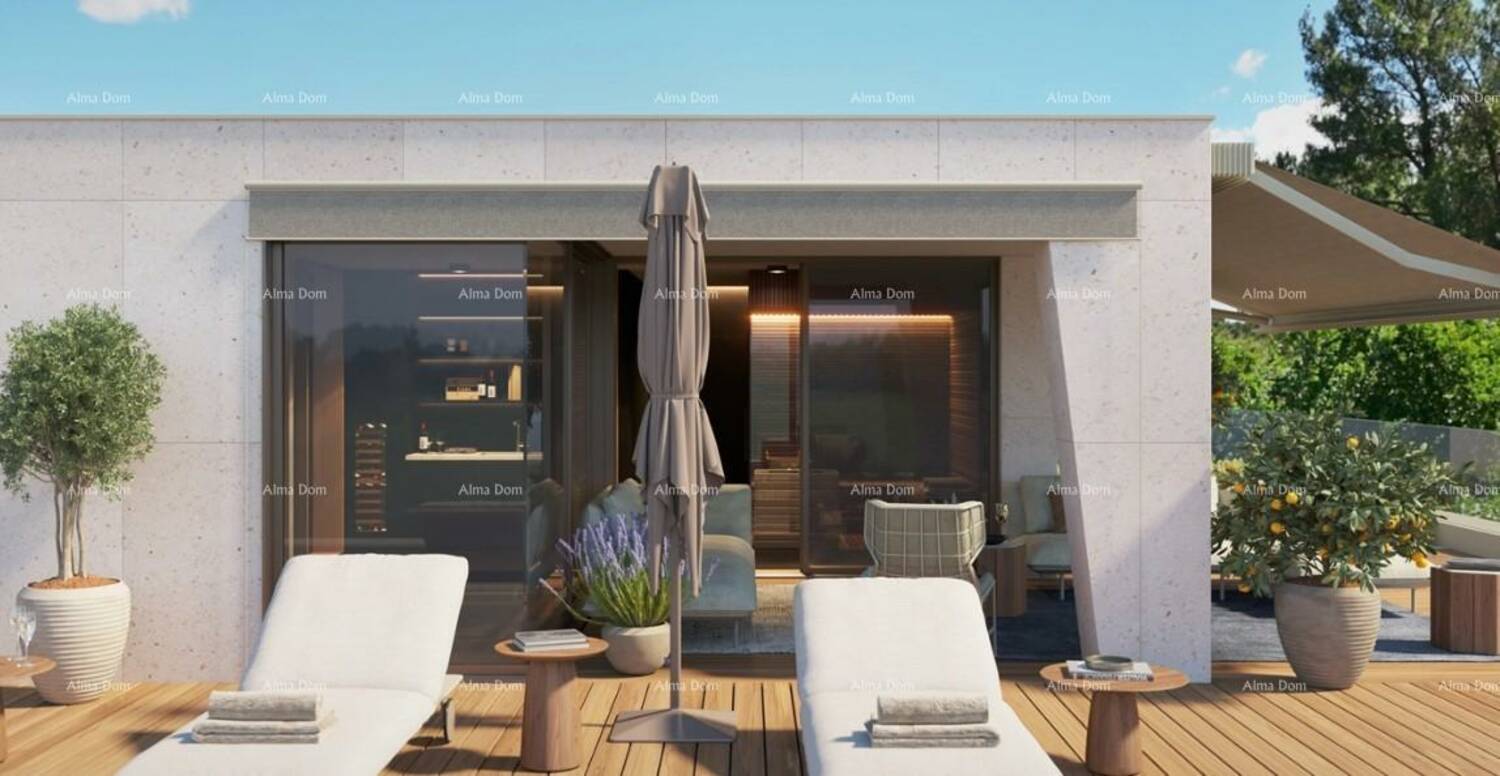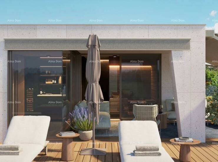 Prodaje se moderna vila u Rovinju. Vila sa dizalom, površine 316 m2, sastoji se od prizemlja, kata i potkrovlja. Nalazi se na parceli 1180 m2 i sastoji se od prostranog dnevnog boravka, koji povezan s velikom natkrivenom terasom, luxuszne kuhinje Poliform koja opremljena vrhunskim uređajima, 3 spavaće sobe s vlastitim kupaonicama, garderobama i natkrivenim terasama. Krovna terasa s jakuzzijem, saunom, emotivnim tušem, barom, toaletom i zelenim vrtom. Natkrivene terase - 164 m². Otvorene terase - 105 m².