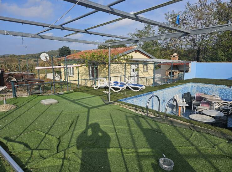 Prostrana terasa, sunčalište i bazen stvaraju idealno okruženje za uživanje na otvorenom. Okućnica je u potpunosti ograđena, što osigurava mir i privatnost, a postoji i nekoliko natkrivenih dijelova terase koji nude dodatne mogućnosti uređenja i organizacije prostora.