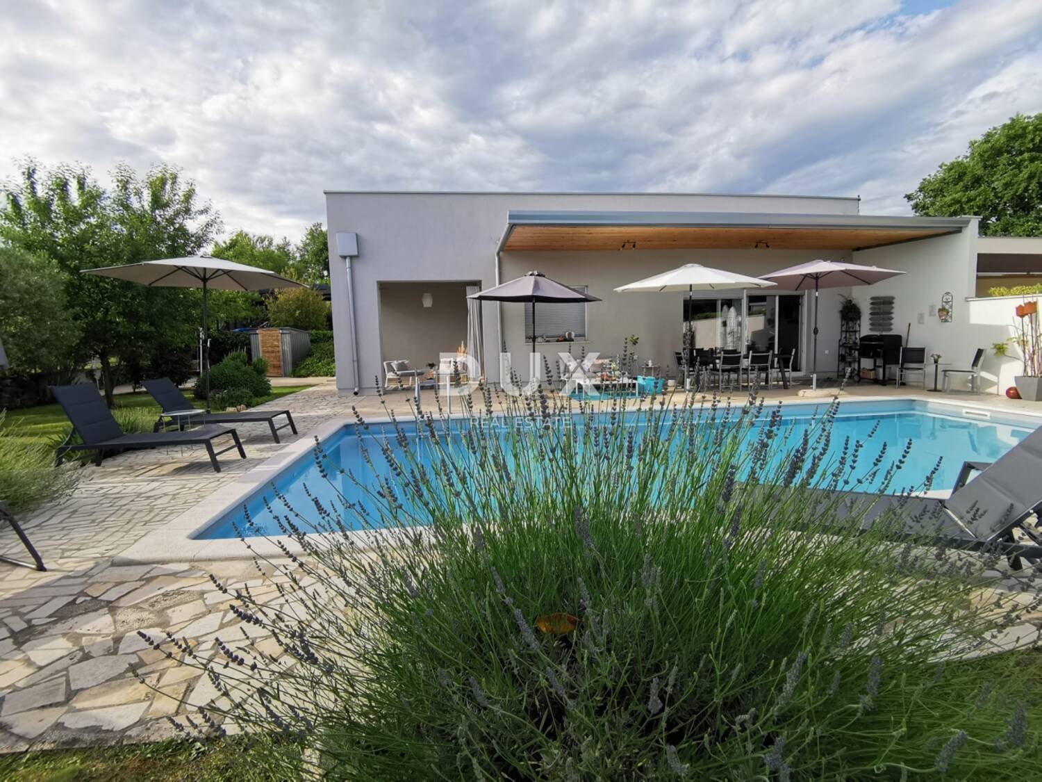 Nedaleko upravo tog grada, u mirnom okruženju zelenila, na prodaju je moderna prizemna dupleks kuća s ravnim krovom, velikim staklenim otvorima i privatnim bazenom, zamišljena kao savršeno mjesto za život ili odmor.