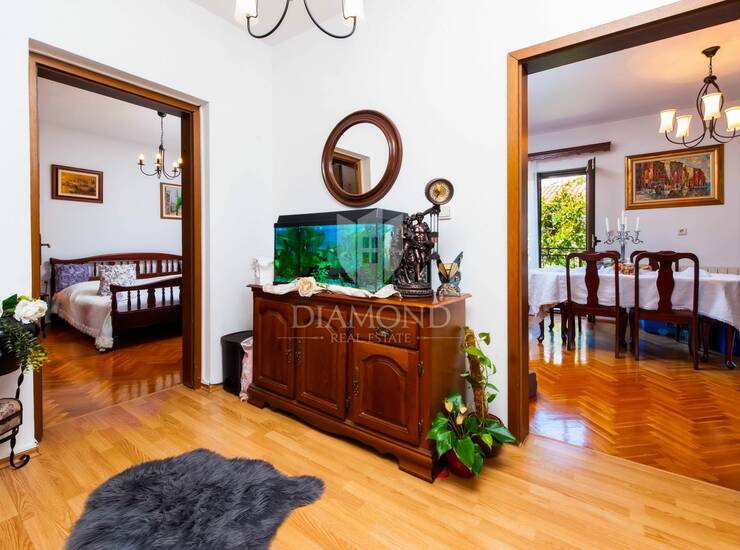 Kuća se proteže kroz podrum i tri nadzemne etaže, a s najviše etaže pruža se pogled na more, što dodatno podiže doživljaj i vrijednost, posebno u turističkom kontekstu. Posebna prednost je podrum koji nudi mogućnost uređenja u dodatnu, lagodnu stambenu jedinicu, čime se može dobiti i treći stan te dodatno povećati kapacitet i potencijal kuće. Grijanje je riješeno centralnim grijanjem na naftu, a uz to je svaka jedinica klimatizirana, što omogućuje ugodan boravak tijekom cijele godine i jednostavno upravljanje prostorom.