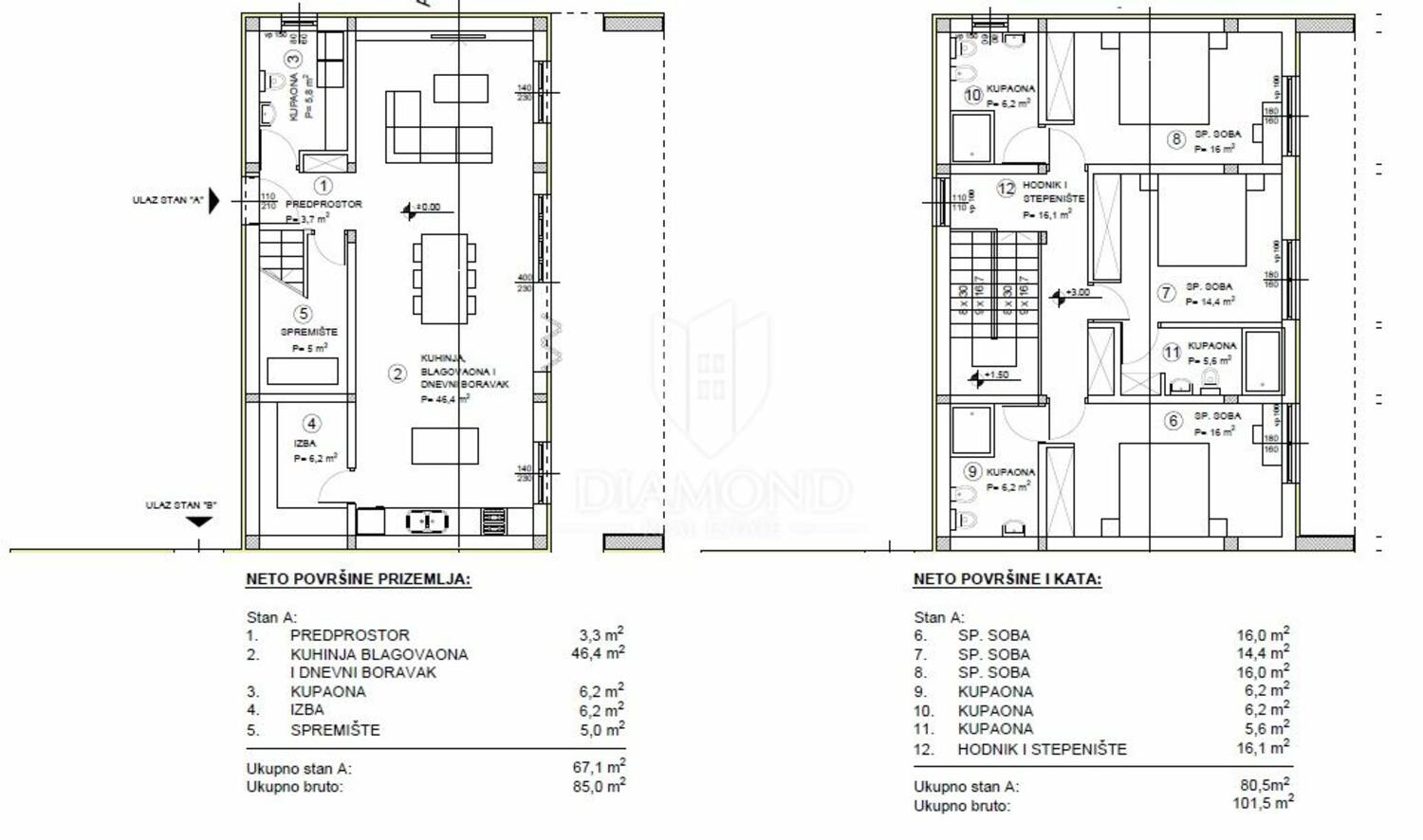Ova dvojna kuća je dizajnirana s naglaskom na privatnost i minimalni susjedski kontakt. Prostire se na dvije etaže s ukupno 147m2 korisne površine, nudeći udoban životni prostor. Prizemlje obuhvaća ulazni hodnik, gostinjski wc, spremište te prostrani otvoreni prostor s kuhinjom, blagovaonicom i dnevnim boravkom. Staklena stijena duž cijele dužine prostora omogućava obilje svjetlosti i izravan pristup bazenu, sunčalištu i dvorištu. Na gornjoj etaži nalaze se tri spavaće sobe, svaka s vlastitom kupaonicom.