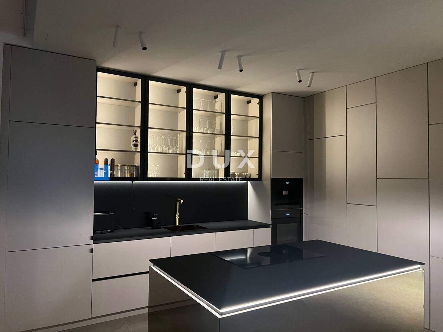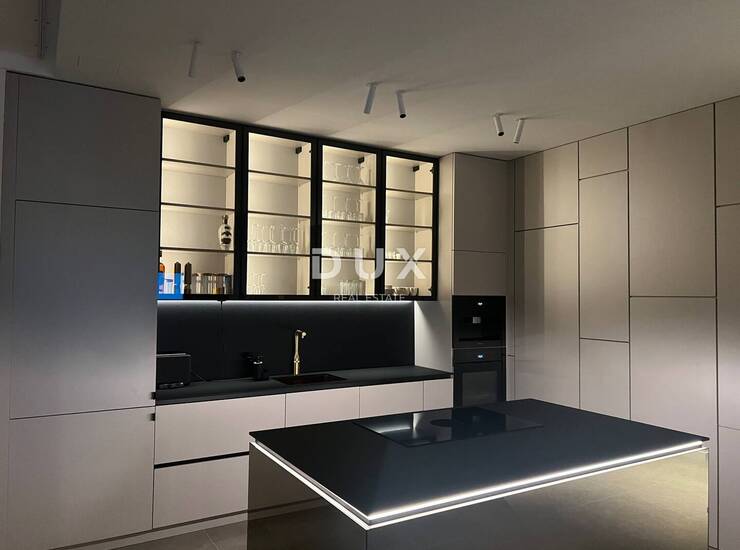 Unutrašnjost kuće uređena je luksuznim talijanskim namještajem, a kuhinja je opremljena vrhunskim Miele kućanskim aparatima, uključujući i Miele aparat za kavu. Velika blagovaonica povezana je s vanjskim prostorom koji uključuje lounge terasu, ljetnu kuhinju s plinskim roštiljem i Kamado Joe keramičkim roštiljem na ugljen, savršenu za večere s prijateljima ili obitelji. Prostrana terasa s blagovaonskim stolom za deset osoba zaštićena je bioklimatskom pergolom, stvarajući ugodnu hladovinu tijekom ljetnih dana.