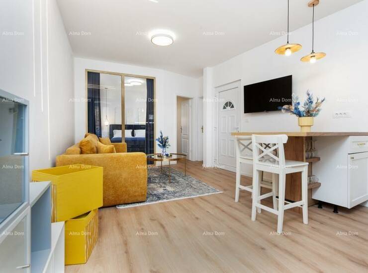 Stan površine 38 m2 sastoji se od dnevnog boravka sa kuhinjom, kupaone, ima posebnu spavaću sobu s prozorom koji gleda na zelenilo, pružajući savršenu kombinaciju autentičnog ugođaja i privatnosti.