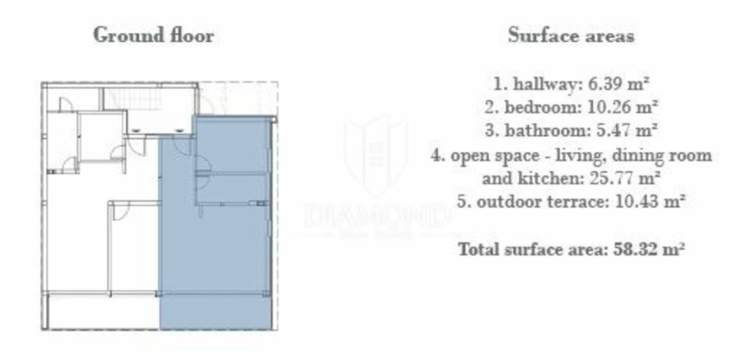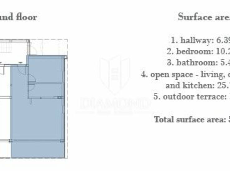 Stan se nalazi u prizemlju i svojim funkcionalnim rasporedom stvara ugodan i prostran dom. Otvoreni koncept dnevnog boravka, kuhinje i blagovaonice povezuje unutarnji i vanjski prostor, dok velika staklena stijena omogućuje obilje prirodnog svjetla i izlaz na privatnu terasu s vrtom. Spavaća soba odiše toplinom, a kupaonica opremljena vrhunskim sanitarijama donosi dodatan osjećaj luksuza.