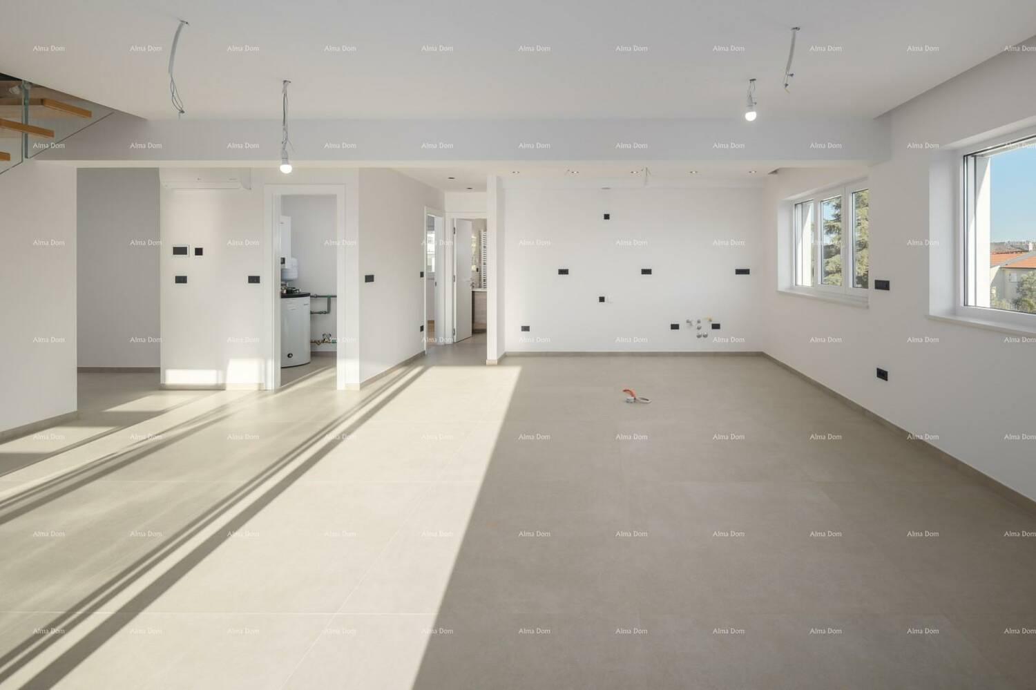 Unutarnje stepenice vode na drugu etažu gdje se nalaze još dvije spavaće sobe, kupatilo i velika krovna terasa sa koje pruža pogled na more i Rovinj.