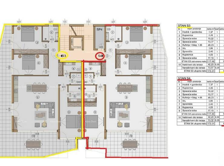 Stan se sastoji od hodnika, kupaonice, tri spavaće sobe, dvije kupaonice, zasebnog toaleta, spremišta , kuhinje s blagavaonicom te dnevnim boravkom, iz dnevnog boravka izlaz na veliku prostranu terasu od cca 56 m2..