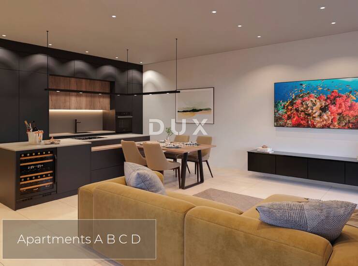 Stan se nalazi na prvome katu te se sastoji od dvije spavaće sobe i dvije kupaonice, prostranog open-space prostora koji obuhvaća kuhinju, blagovaonicu i dnevni boravak, praonice, loggie te skladišta. Nekretnini pripadaju parkirno mjesto i garaža, a nalazi se svega nekoliko stotina metara od mora.