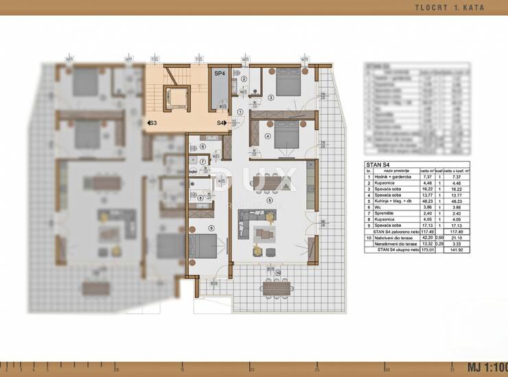 Stan se sastoji od prostora otvorenog koncepta koji ujedinjuje kuhinju, blagovaonicu i dnevni boravak, tri spavaće sobe, dvije kupaonice, gostinjskog toaleta i spremišta. Sve prostorije imaju pristup prostranoj terasi s koje se pruža pogled na more.