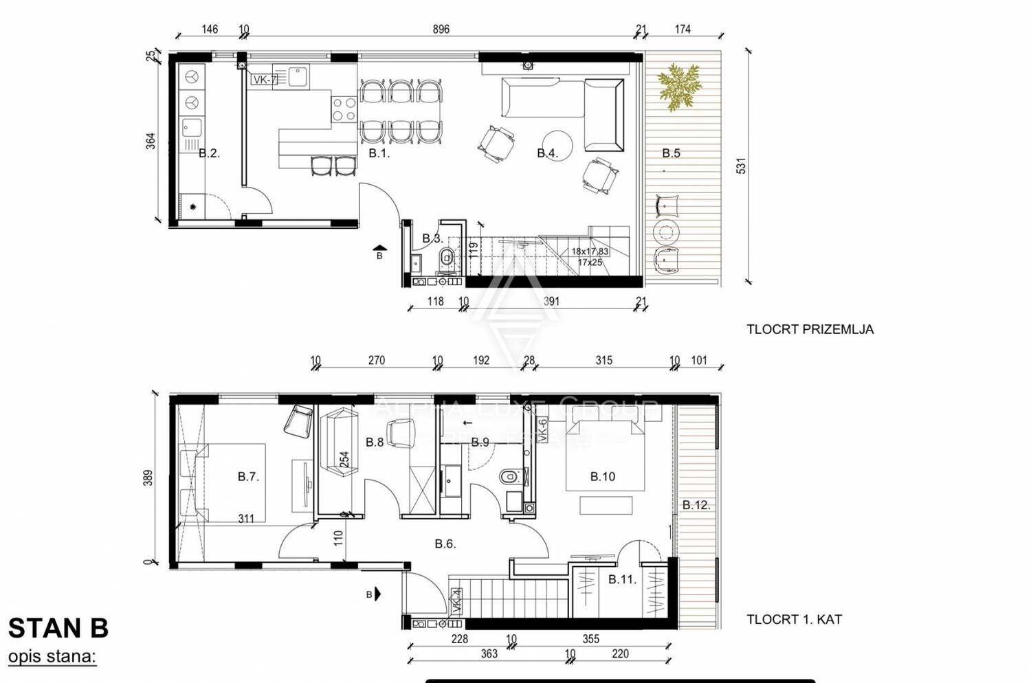 Prizemlje se sastoji od ulaznog hodnika, gostinjskog toaleta, spremišta/utility sobe te otvorenog prostora kuhinje, blagovaonice i dnevnog boravka s unutarnjim stubištem. Na prvom katu nalaze se dvije spavaće sobe, walk-in garderoba i kupaonica. Vanjski prostori uključuju natkrivenu terasu, terasu s pergolom, privatni vrt i loggiu na prvom katu. Stanu pripadaju jedno garažno i jedno vanjsko parkirno mjesto. Neto korisna površina iznosi 87,03 m², dok je ukupna obračunska površina 112,40 m².