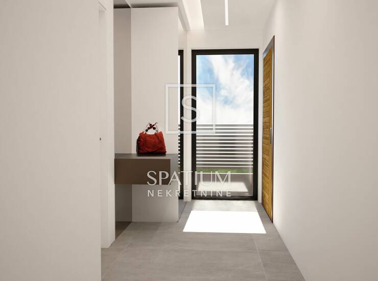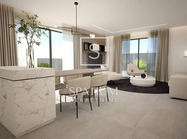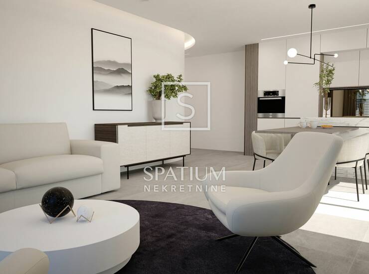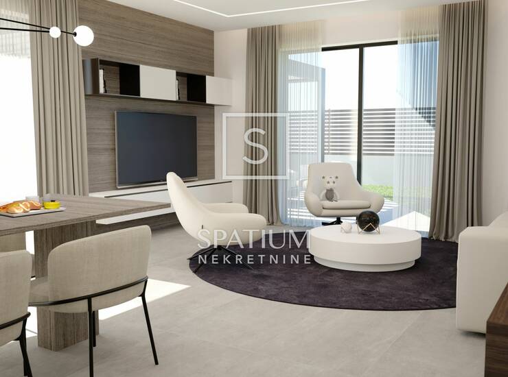Stan se nalazi u modernoj zgradi s ukupno četiri stambene jedinice u prizemlju. Obuhvaća prostranu kuhinju s blagovaonom i velikim dnevnim boravkom, dvije spavaće sobe – svaka s vlastitom kupaonicom – dodatnu kupaonicu i WC u dnevnom dijelu, kao i veliku natkrivenu terasu. Pripadaju mu i dva garažna parkirna mjesta u podrumu zgrade, spremište površine 11,44 m², uređeno dvorište površine 176,23 m²
