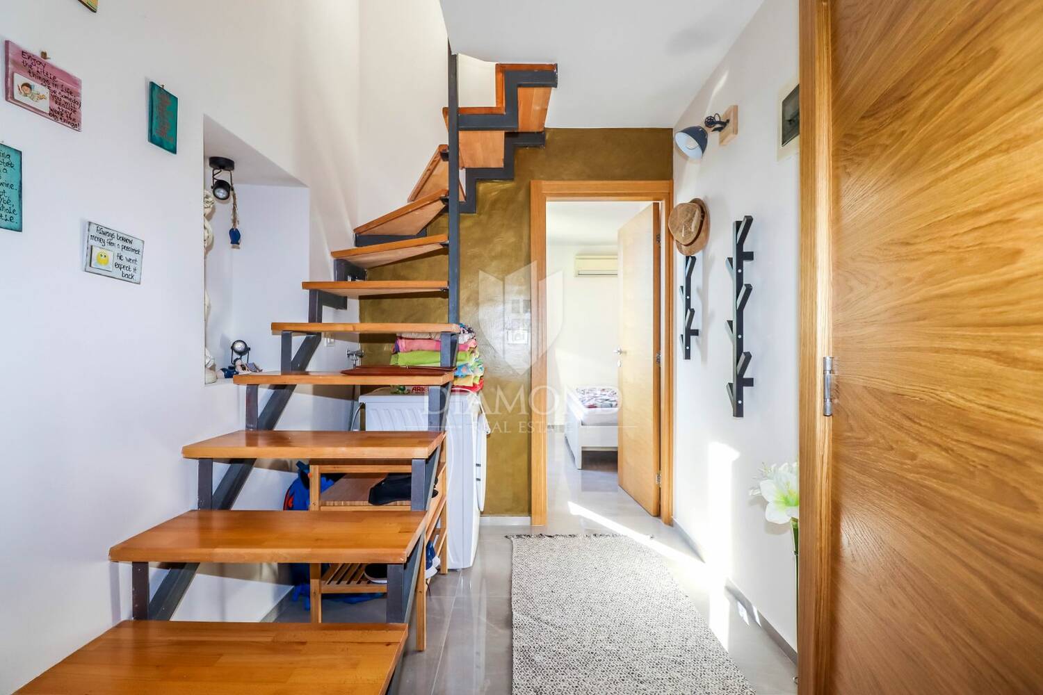 Stan se proteže na dvije etaže i ukupno 60 m². Na donjoj etaži nalaze se dvije spavaće sobe, a svaka ima pristup vlastitoj kupaonici, čime se postiže visoka razina praktičnosti i privatnosti. Unutarnjim stepenicama dolazi se na gornju etažu, gdje je smješten otvoreni prostor kuhinje, blagovaonice i dnevnog dijela. Upravo blagovaonicu čini posebnom veliki prozor koji zauzima gotovo cijeli zid, a tijekom ljeta se pretvara u gotovo potpuno otvoren prostor s prekrasnim pogledom na more i rovinjsku luku.