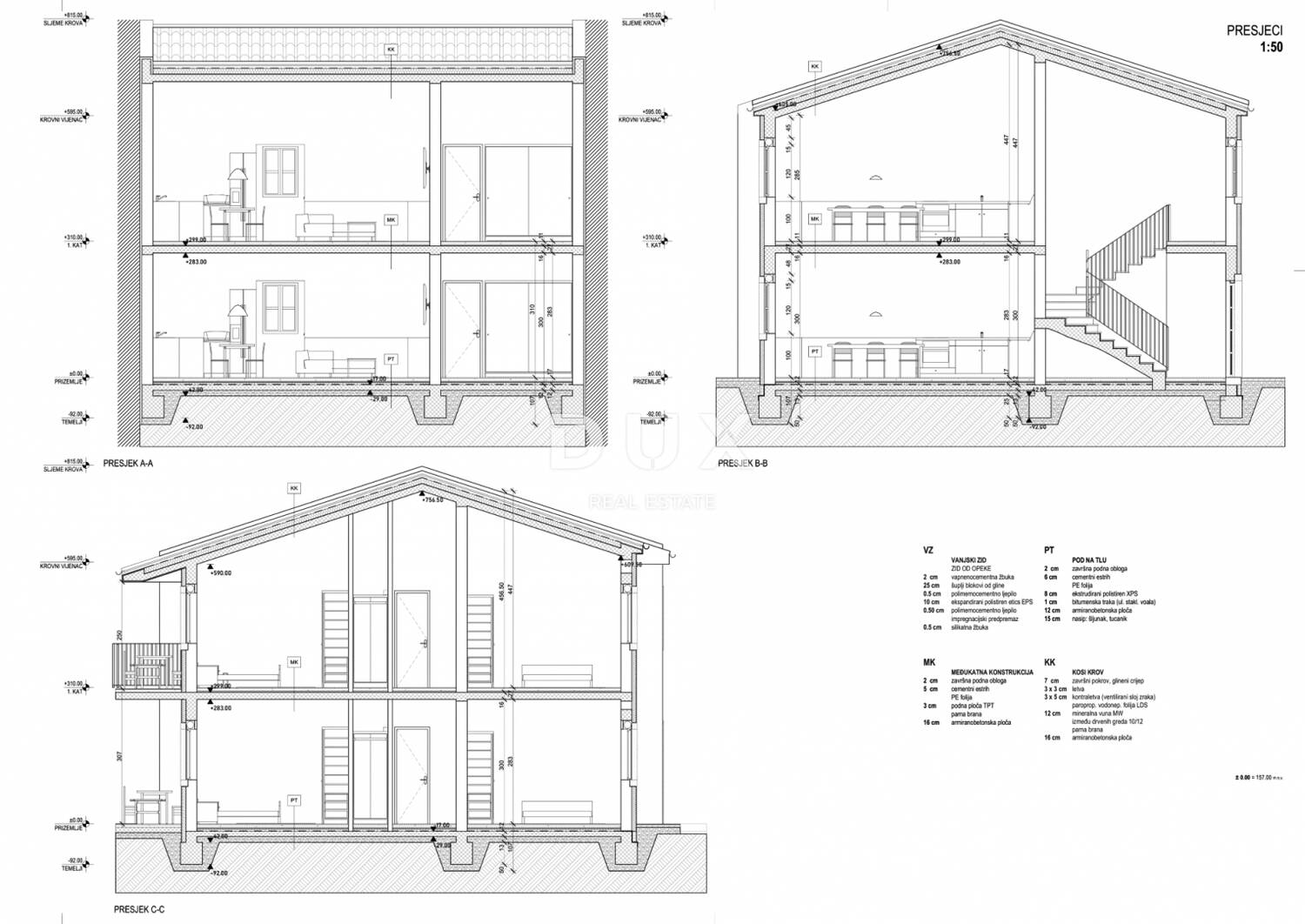 Poluugrađena obiteljska građevina bezvremenskog dizajna s dvije stambene jedinice se oblikovno i koloristički uklapa u naselje i krajolik i proteže se kroz prizemlje i prvi kat.