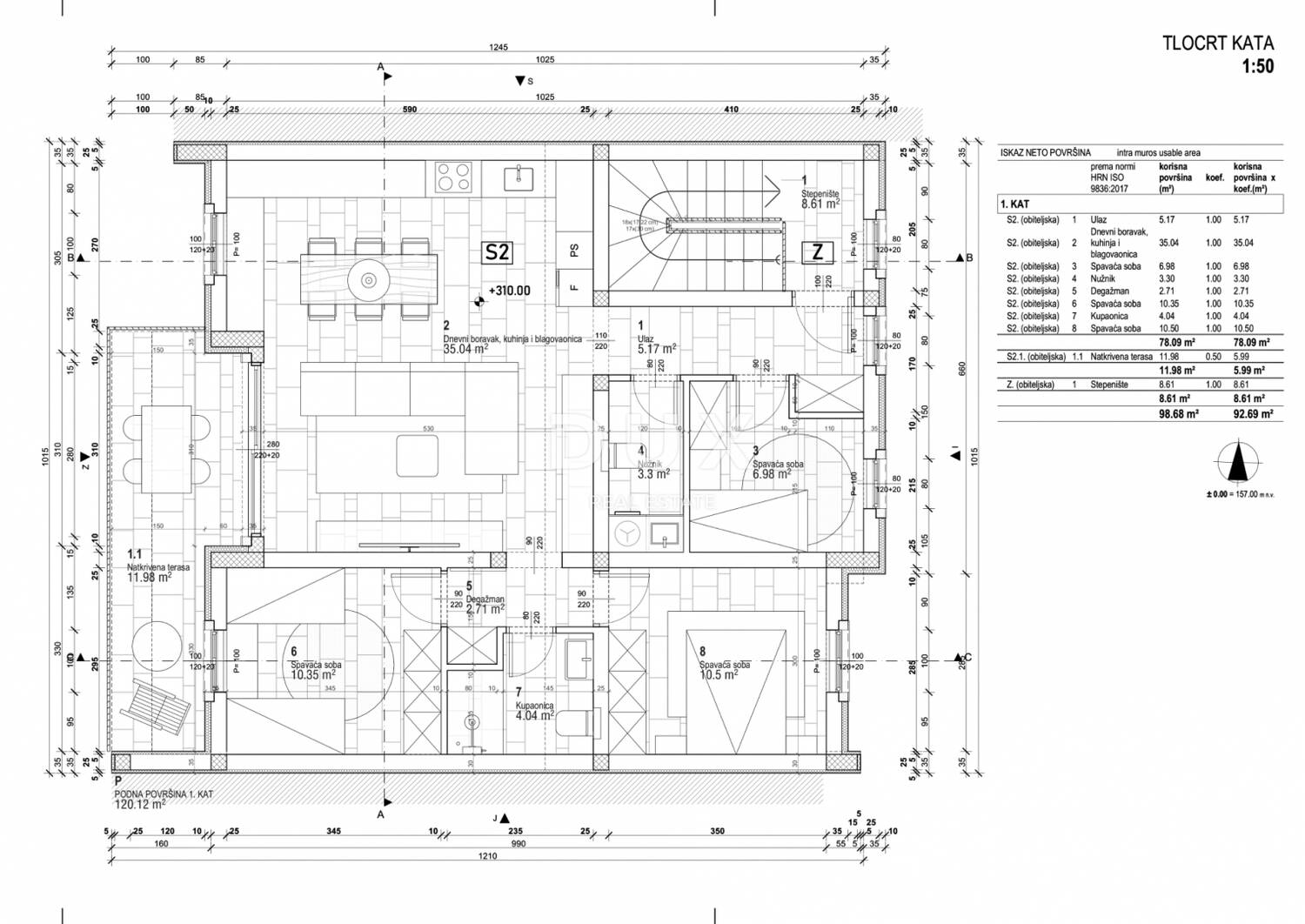 Neto kvadratura s obračunatim koeficijentima iznosi 84,08 m² dok neto kvadratura bez obračunatog koeficijenta iznosi 90,07 m² a uključuje stambeni dio površine 78,09 m² i natkrivenu terasu površine 11,98 m².
