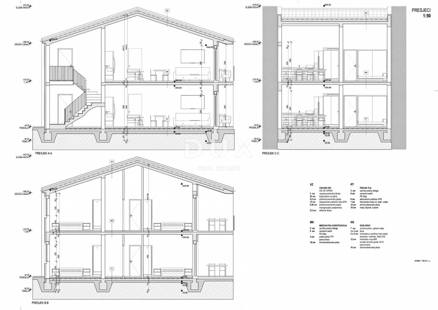 Poluugrađena obiteljska građevina bezvremenskog dizajna s dvije stambene jedinice se oblikovno i koloristički uklapa u naselje i krajolik i proteže se kroz prizemlje i prvi kat.