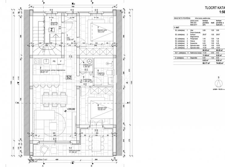Neto kvadratura s obračunatim koeficijentima iznosi 65,72 m² dok neto kvadratura bez obračunatog koeficijenta iznosi 71,24 m² a uključuje stambeni dio površine 60,20 m² i natkrivenu terasu površine 11,04 m².