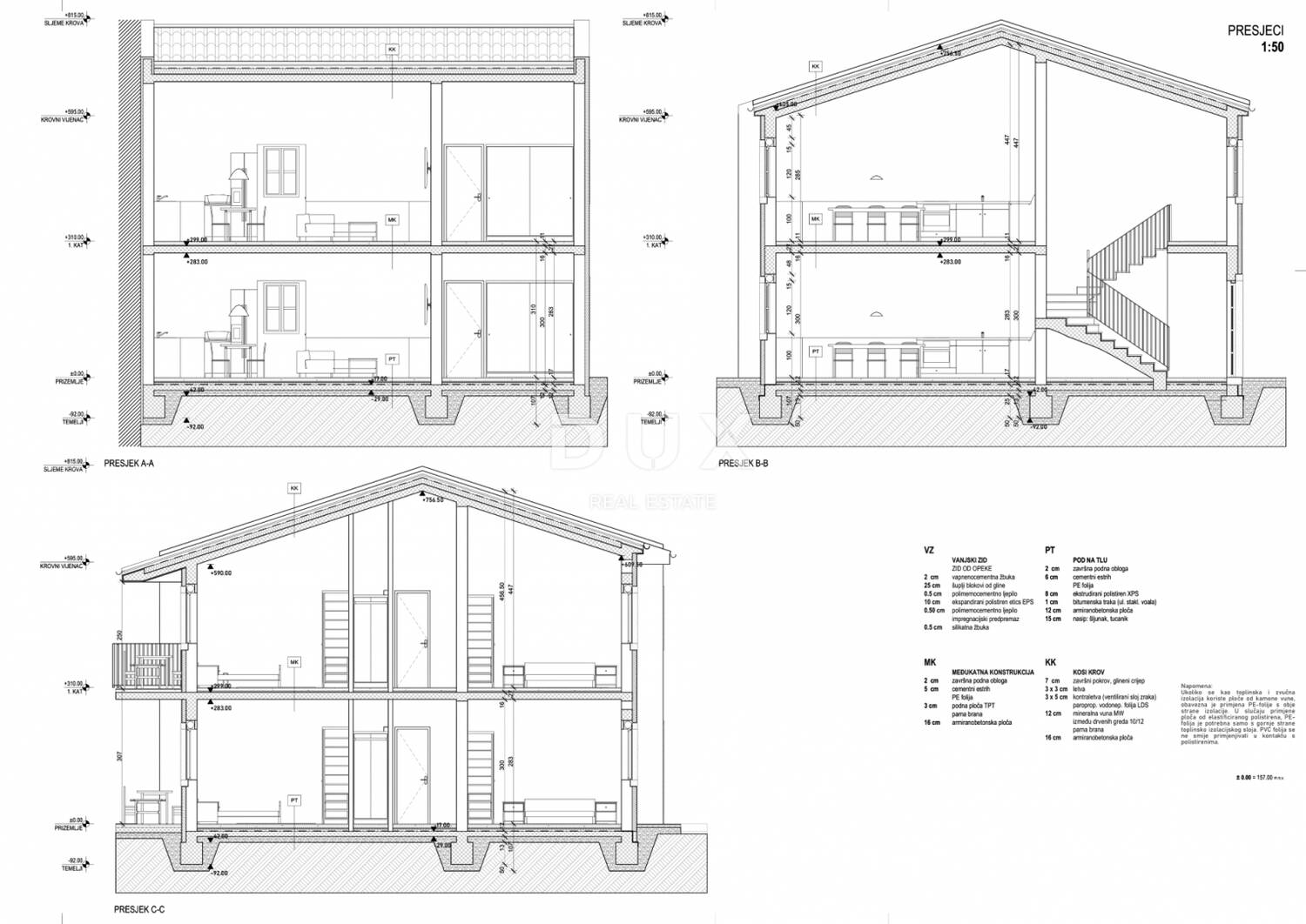 Poluugrađena obiteljska građevina bezvremenskog dizajna s dvije stambene jedinice se oblikovno i koloristički uklapa u naselje i krajolik i proteže se kroz prizemlje i prvi kat.