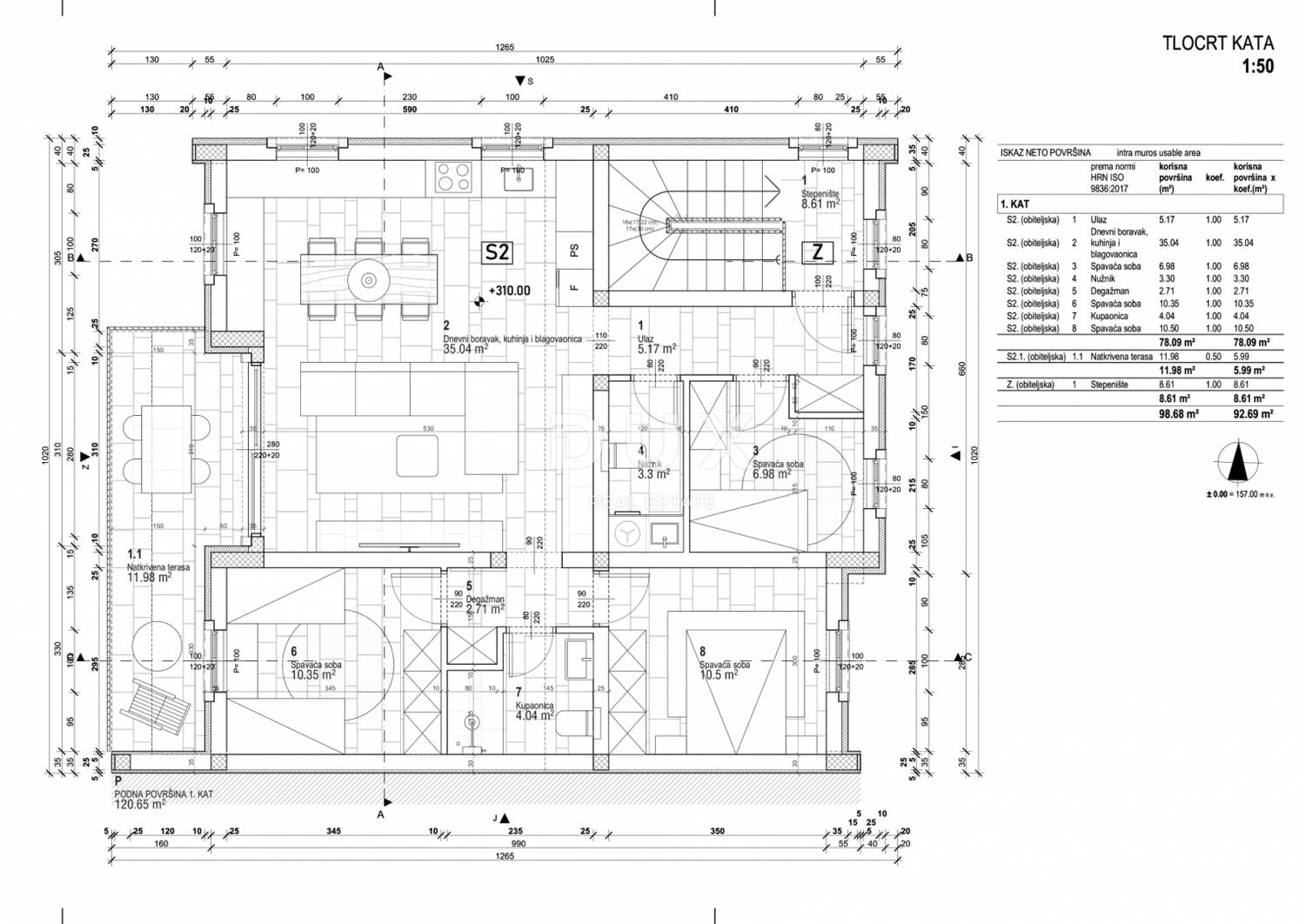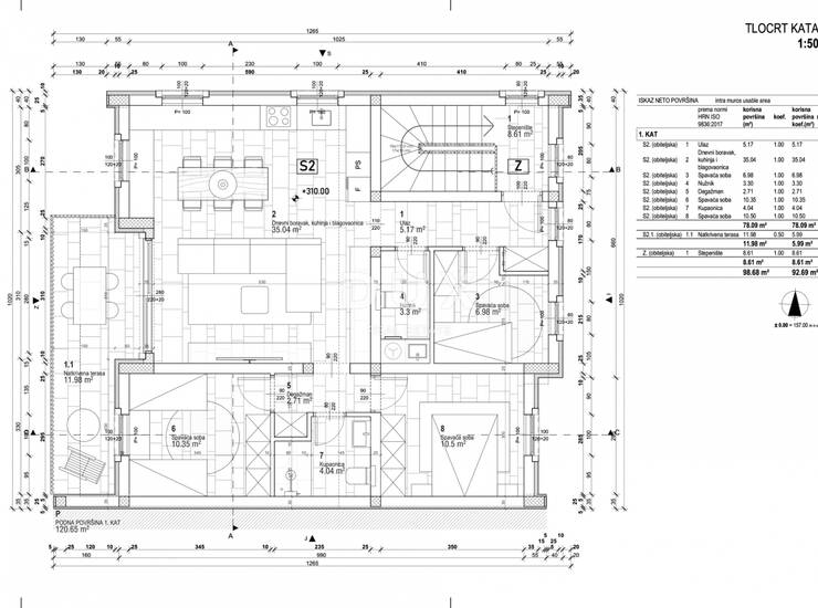 Neto kvadratura s obračunatim koeficijentima iznosi 84,08 m² dok neto kvadratura bez obračunatog koeficijenta iznosi 90,07 m² a uključuje stambeni dio površine 78,09 m² i natkrivenu terasu površine 11,98 m².