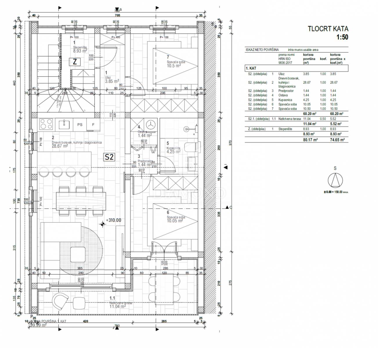 Zgrada se sastoji od dvije stambene jedinice – jedne u prizemlju i jedne na katu – a dio je manjeg projekta koji broji ukupno četiri ovakve zgrade. Prodaje se stan na prvom katu površine 60 m², s natkrivenom terasom od 11 m² koja omogućuje stvaranje intimnog vanjskog prostora. U cijenu je uključeno i parkirno mjesto.