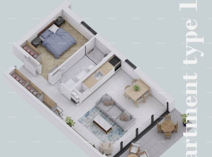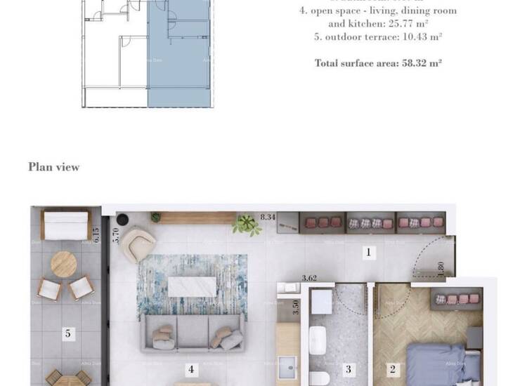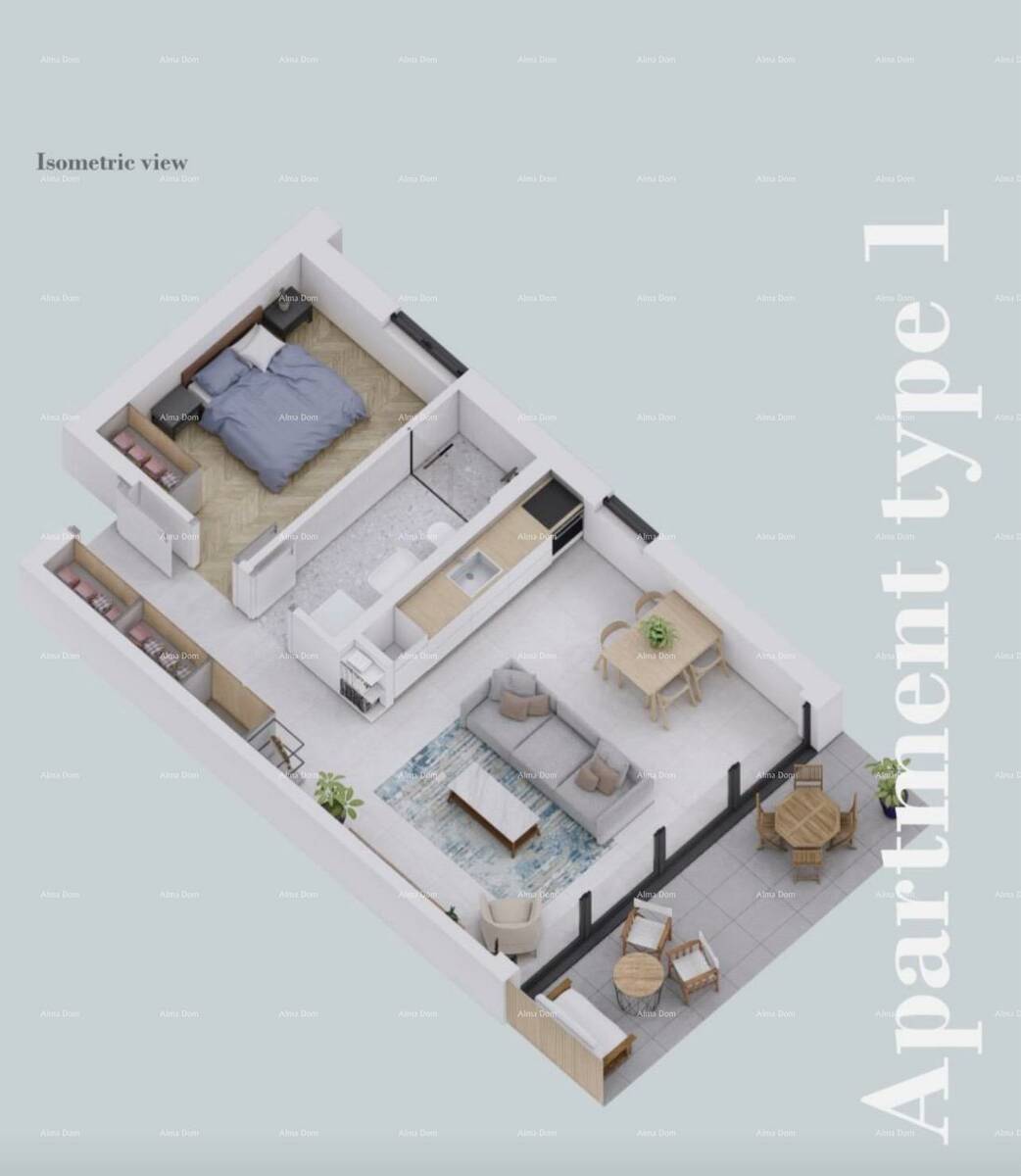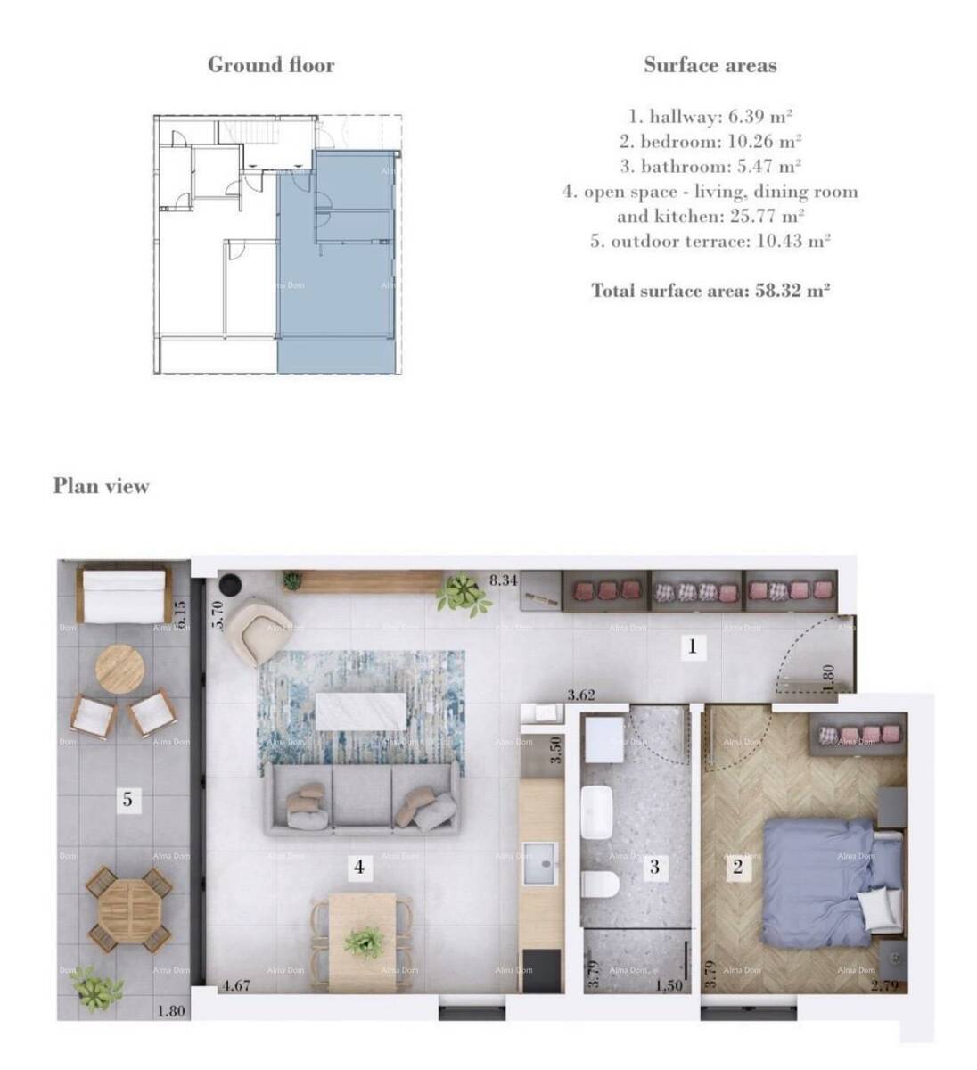 Stan se nalazi u prizemlju i ukupne je površine 58,32 m². Sastoji se od hodnika, spavaće sobe, kupaonice, kuhinje te dnevnog boravka s blagovaonicom. Posebna vrijednost stana je terasa površine 10,43 m² s pripadajućim vrtom ispred terase, idealnim za opuštanje i boravak na otvorenom.