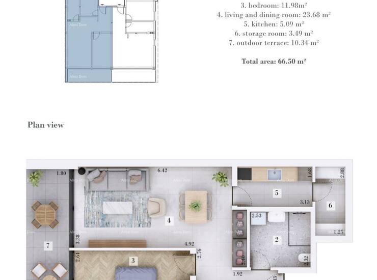 Sastoji se od hodnika, spavaće sobe, kupaonice, kuhinje, dnevnog boravka s blagovaonicom, ostave te terase površine 10,34 m².